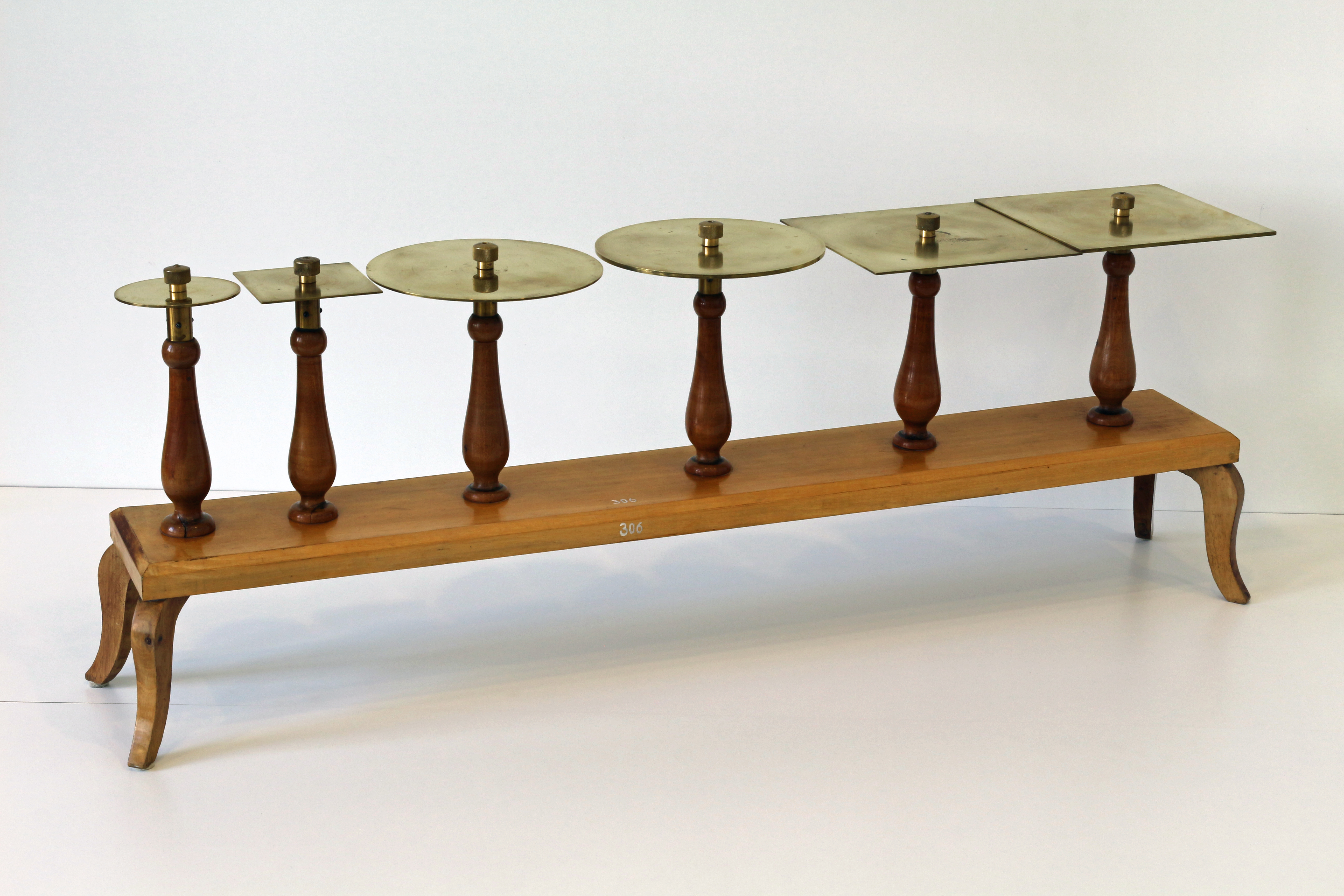 6 Stück Messingplatten unterschiedlicher Form und Dicke auf Holzgestell. Datierung: vor 1909.