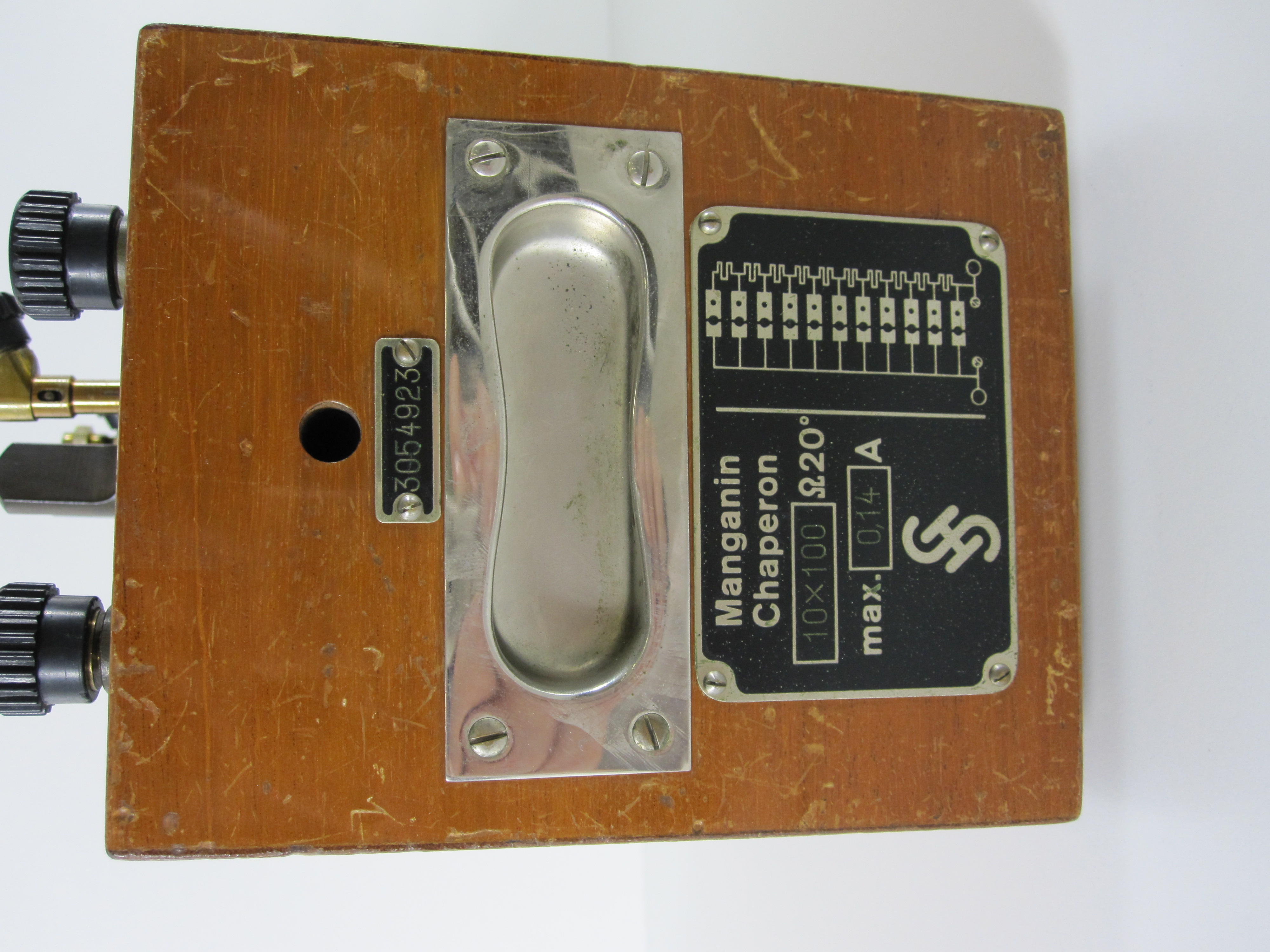 Stöpselwiderstand, Manganin Chaperon, 10 x 100 Ohm (20°C), Max. 0,14 A, Siemens & Halske, Nr. 3054923 - Detail
