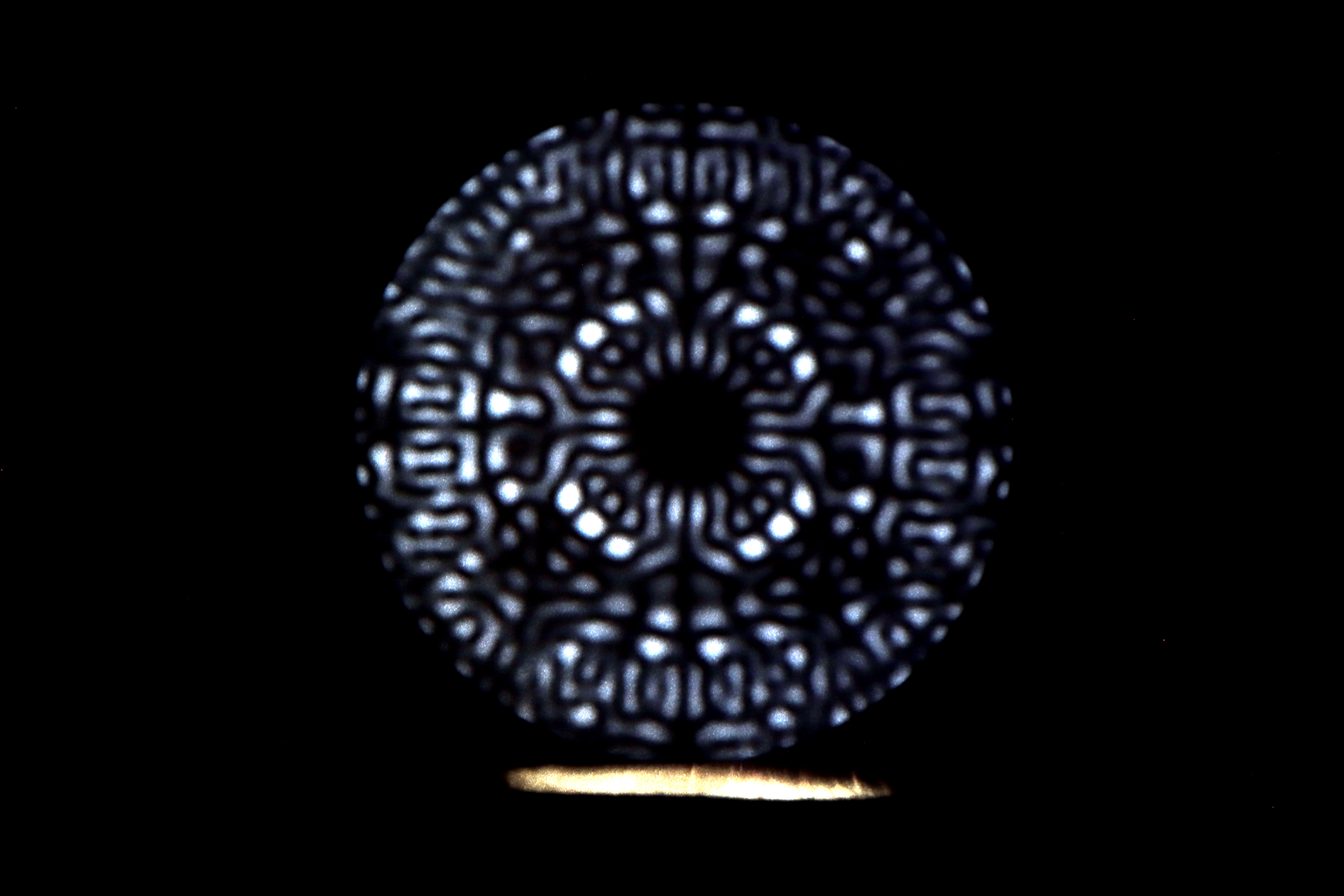 Die Experimente wurden von Anna Kopf und Franz Sachslehner mit enthusiastischer Unterstützung von Dr. Heribert Tilgner durchgeführt. Das Bild zeigt durch Ultraschall (ca. 2,6 MHz bis 4 MHz) angeregte Schwingungen eines Glaszylinders mit einem Durchmesser von 18,7 mm und einer Höhe von 19,9 mm. Er liegt auf einem Schwingquarzplättchen (20 mm x 20 mm x 1 mm). Schwingt das Plättchen mit Ultraschallfrequenz, werden je nach Anregungsfrequenz elastische Schwingungen im Glaszylinder angeregt. Diese können mittels polarisiertem Licht (Dunkelfeld, d.h. gekreuzte Linearpolarisatoren) aufgrund des Phänomens der Spannungsdoppelbrechung sichtbar gemacht werden. In einfachen Fällen kann man sich dunkle Stellen als Schwingungsknoten, helle Stellen als Schwingungsbäuche vorstellen. Genaugenommen erscheinen die Stellen hell, an denen der Zylinder radial und