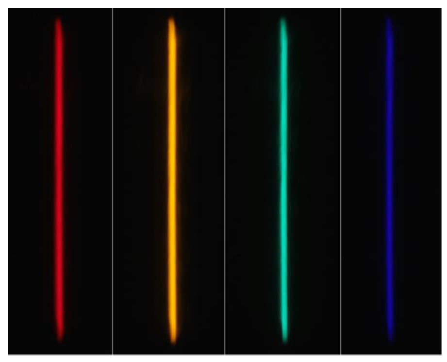Das Bild zeigt zusammengestellte Aufnahmen von den Linien einer He-Spektrallampe mit genanntem Gerät: Inv. Nr. VI/90, Fa. Fuess, Schrift auf Trommelspindellager: "R. Fuess, Berlin Steglitz", Höhe 29 cm.