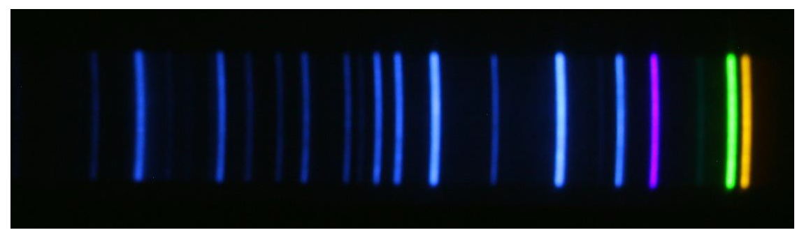 UV-Spektrum einer Hg-Dampflampe mit genanntem Gerät: Spektralapparat von Zeiss Jena, Beschreibung: Festarmiger Prismen Spektralapparat in Holzkassette, Fa. Zeiss Inventarnummer: VI/252, Fabr.Nr.: 6756, Kennzeichnung: Gravur auf Fernrohr; Carl Zeiss Jena, No. 6756. Abmessung: Länge über alles 73 cm. Zubehör: Fotokamera, neben zwei Glasprismen gibt es auch zwei Quarzprismen.