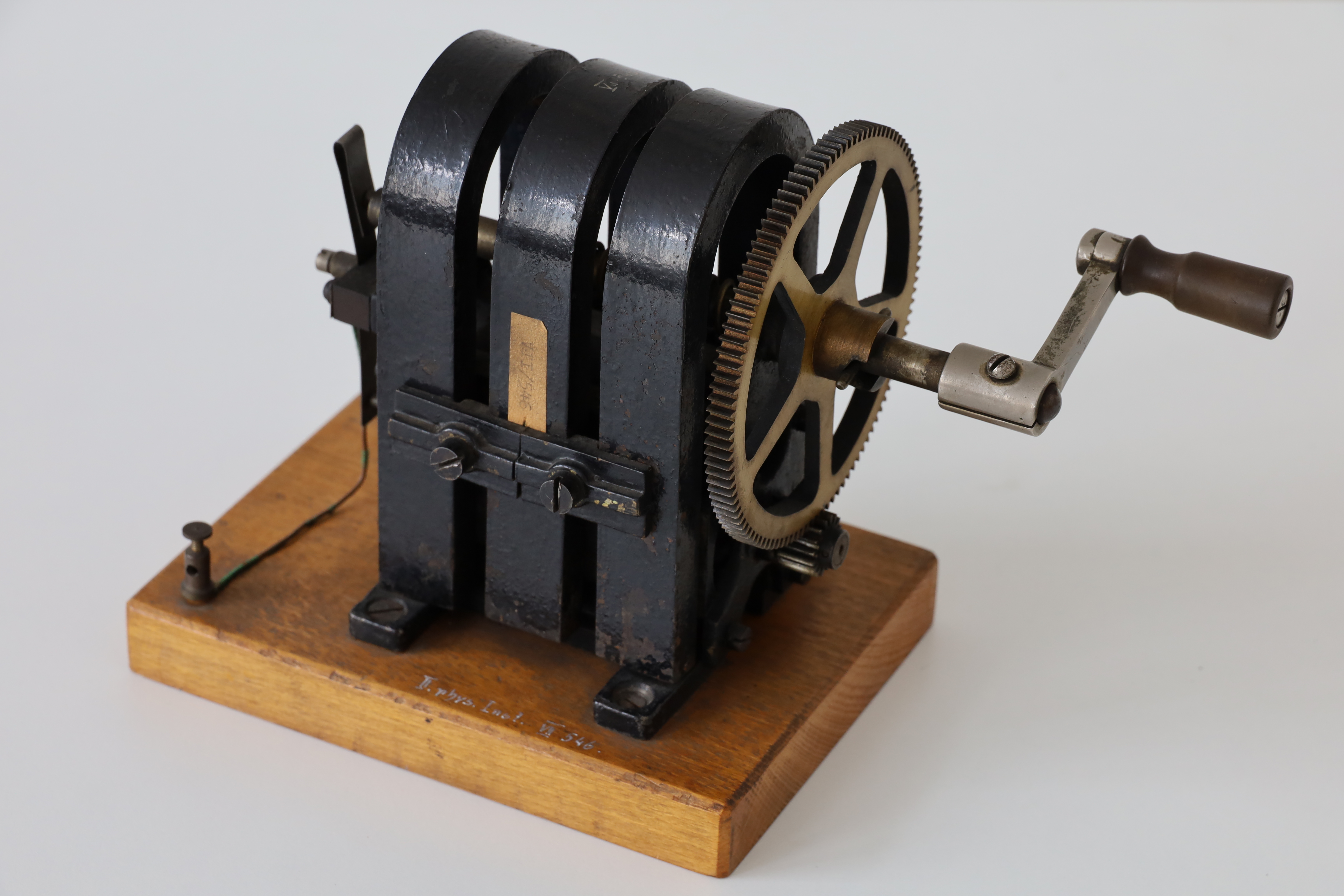 Auch Magnetelektrische Maschine genannt. Inv.-Nr. VII/546. Grundplatte 16 x 11 cm. Erzeugt Wechselspannung, im Leerlauf 11 V effektiv (bei mäßigem Kurbeln).