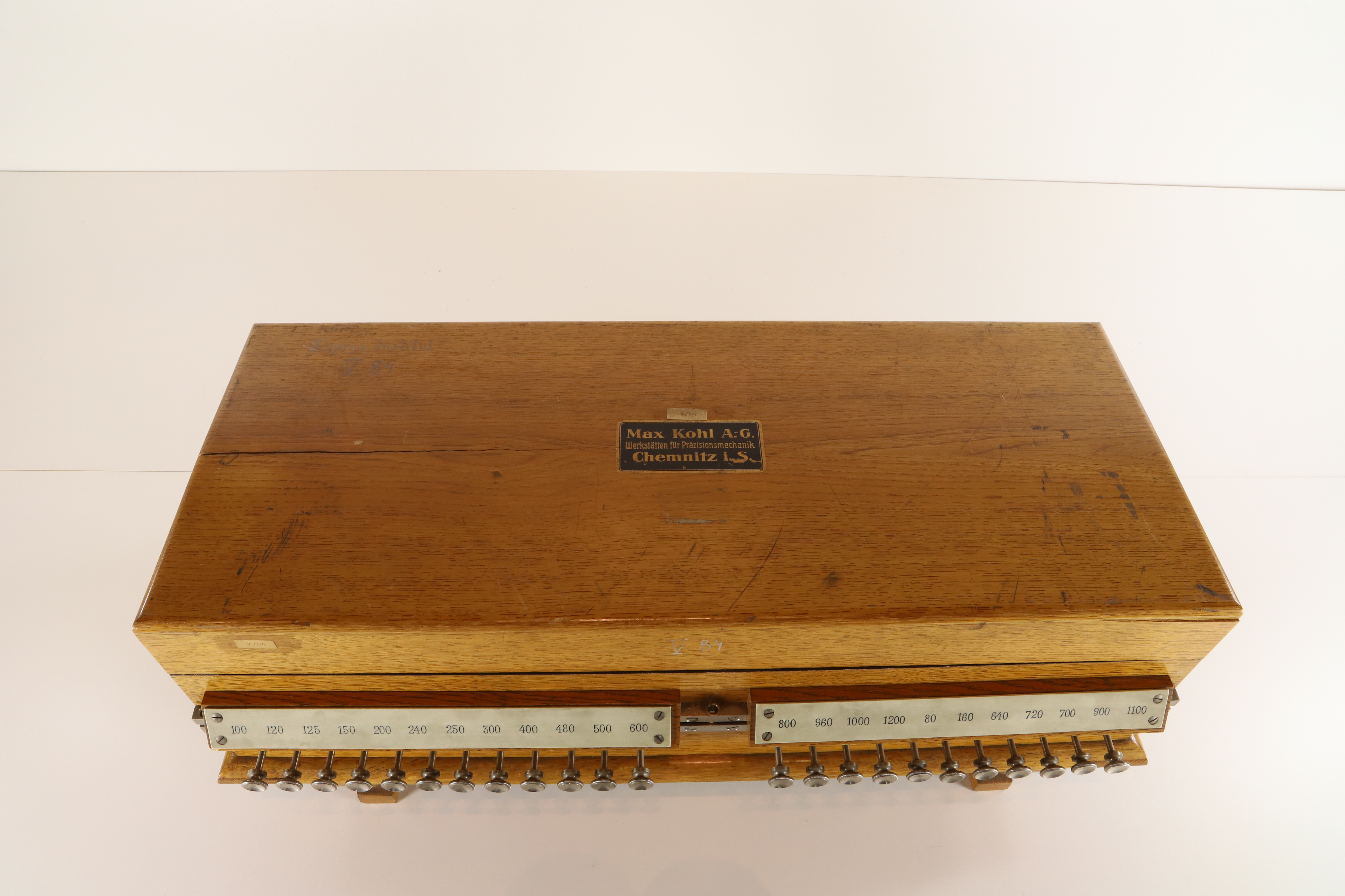 Dreiklangapparat nach Stumpf, Inv.-Nr. V/84. Firmenschild auf Gehäusedeckel: "Max Kohl A.G. Werkstätten für Präzisionsmechanik,