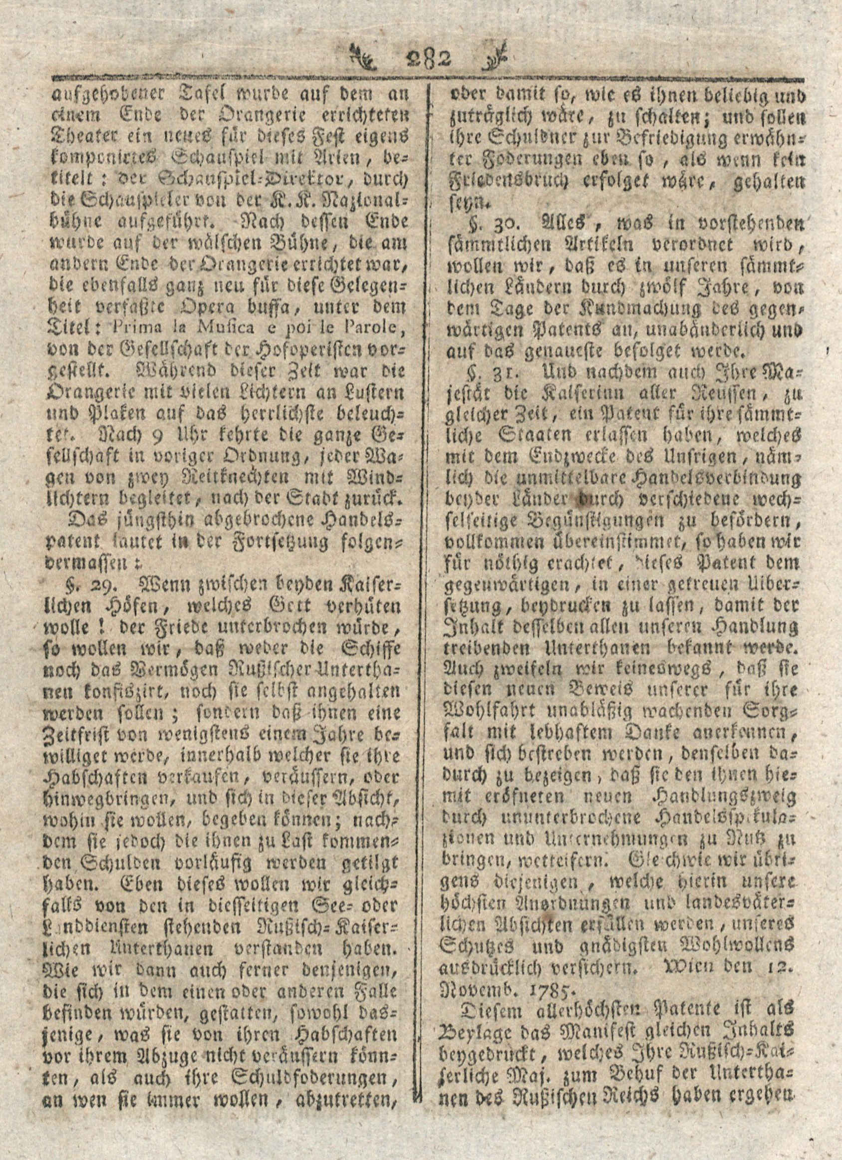 Das Fest in der Orangerie zu Schönbrun, 1786 Berichterstattung über das Fest in der Orangerie von Schönbrunn, Wiener Zeitung, 8. Februar 1786 – Quelle: Universitätsbibliothek Wien Als führende Zeitung der Monarchie – die Auflage rangierte vermutlich bei mehreren tausend Stück – nutzte sie der Kaiser Joseph II. als Verlautbarungsblatt. Seite 2 von 2