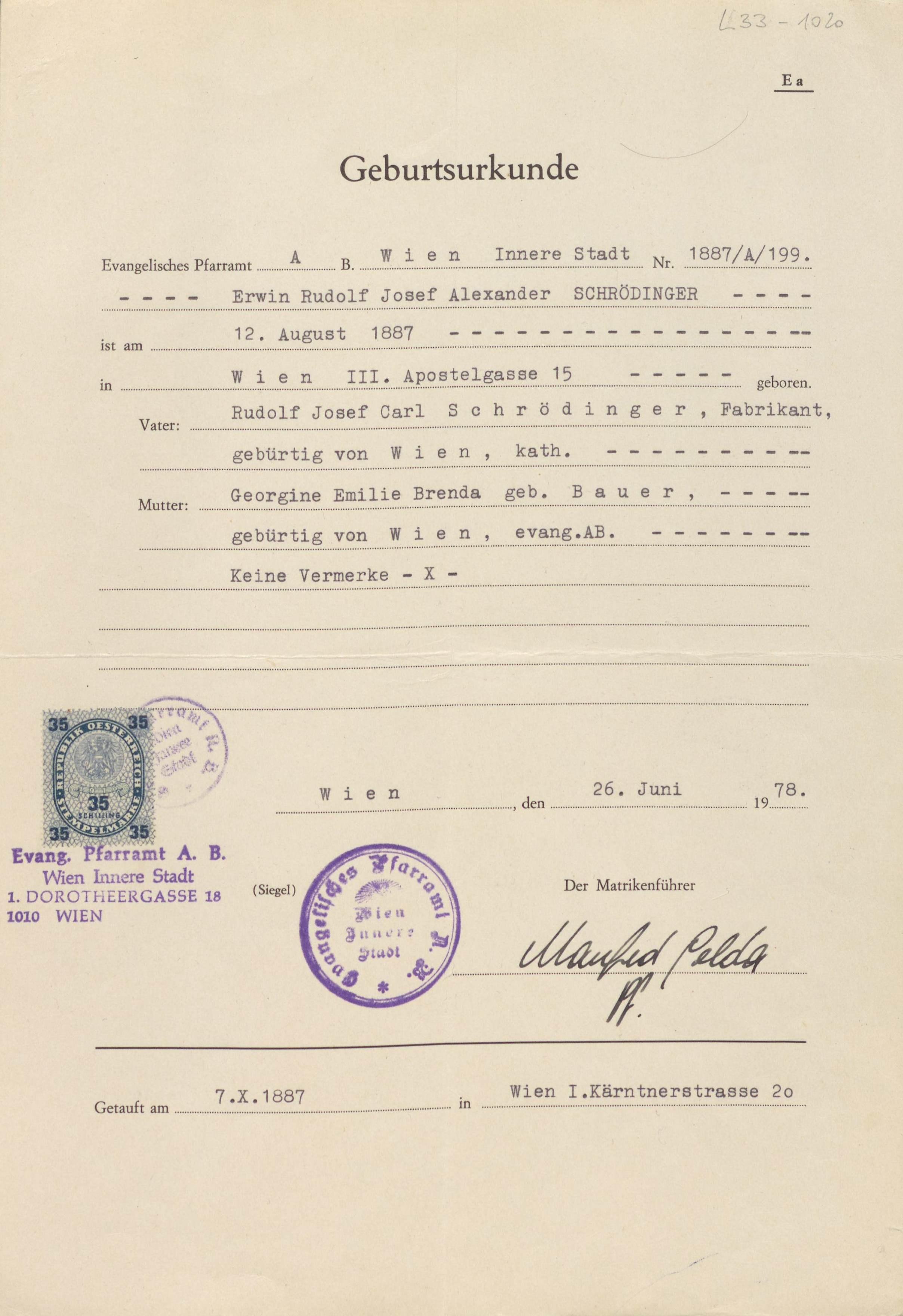 Provenienz: Diese Urkunde wurde im Auftrag der Österreichischen Zentralbibliothek für Physik vom Pfarramt angefertigt.
