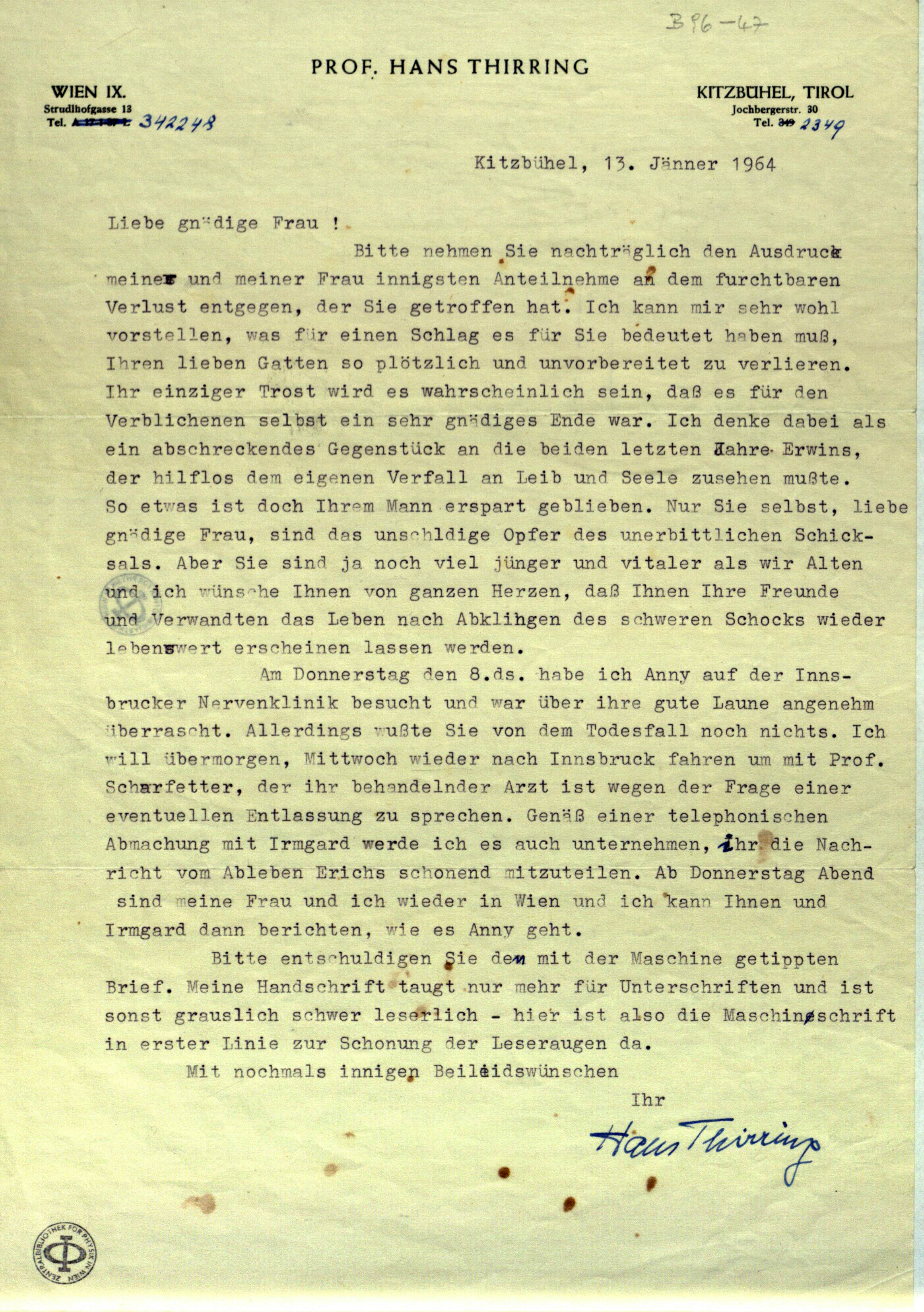 Brief von Thirring, Hans an Bertel, Maria (Kitzbühel, Tirol, 1964-01-13)
