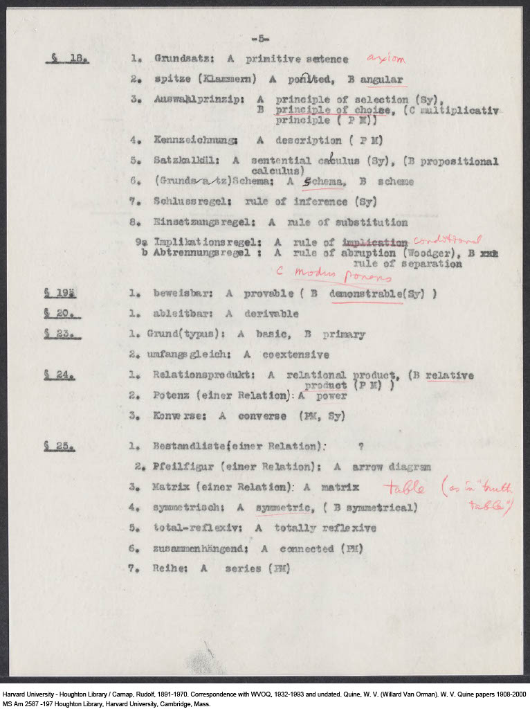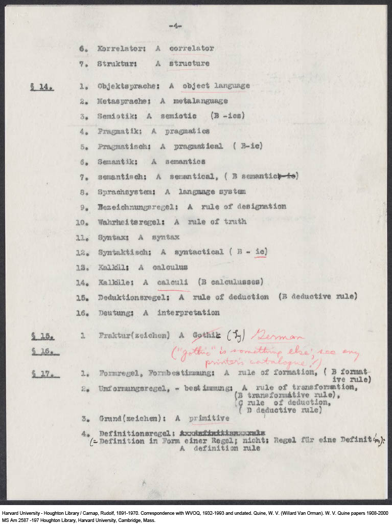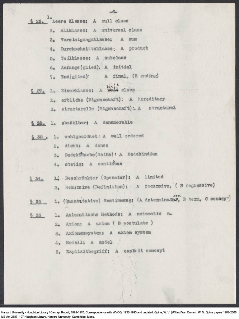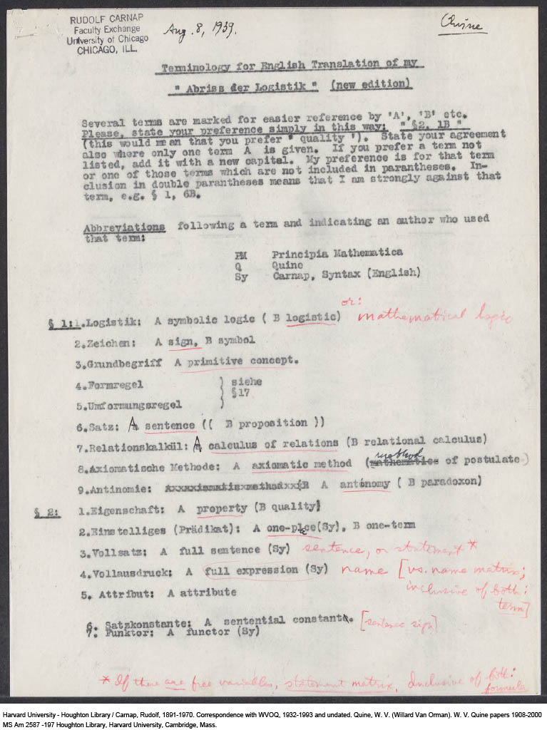 Carnap, Terminology for English Translation of my "Abriss der Logistik"(new edition), 1939-08-08 (M) (Copy)