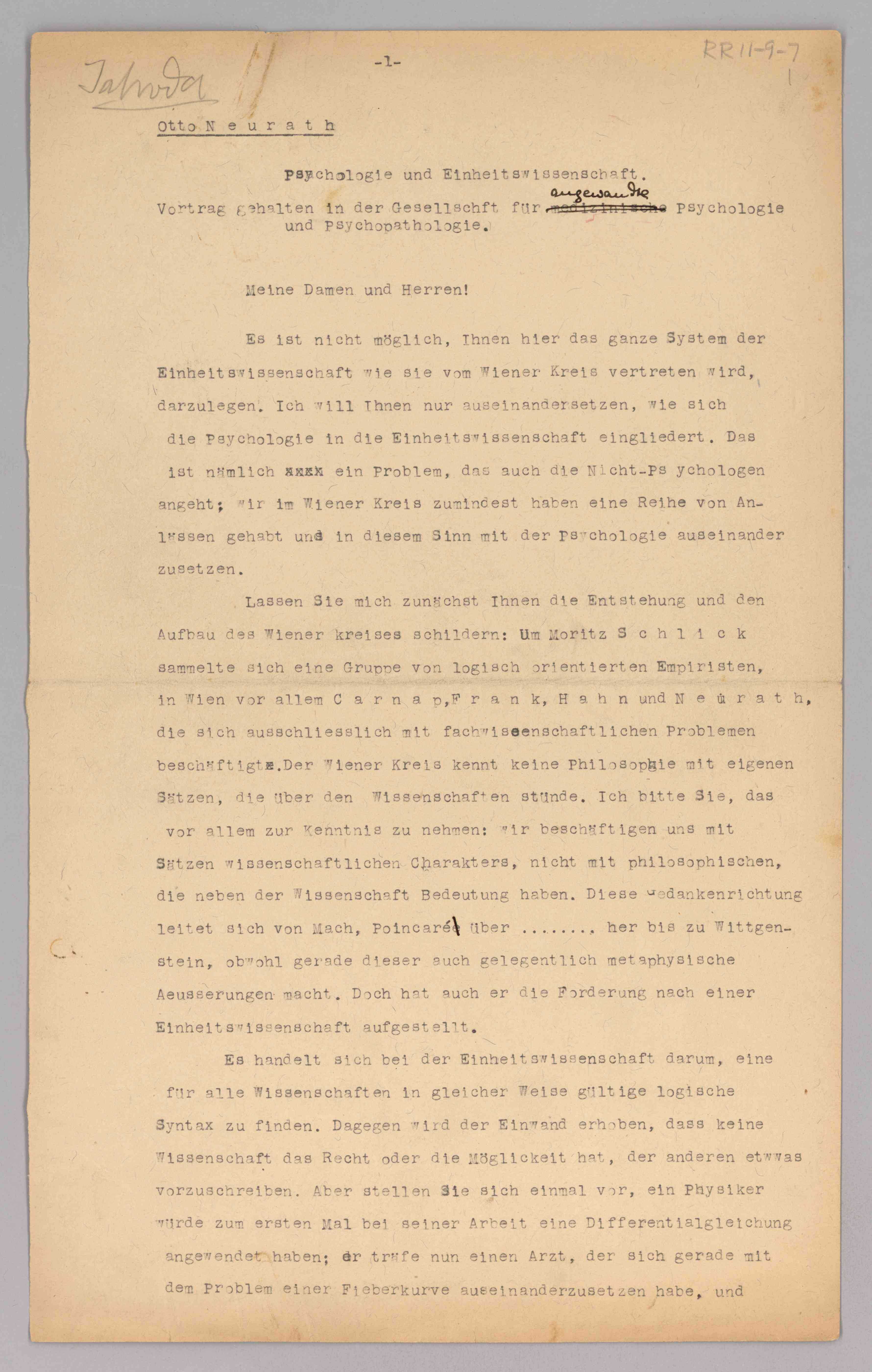 ASP Archive>Rand Collection>Box 11>Folder 9 ''Wiener Kreis᠄ Vorträge und Diskussion'' and ''Thesen,'' 1931-1932 and undated