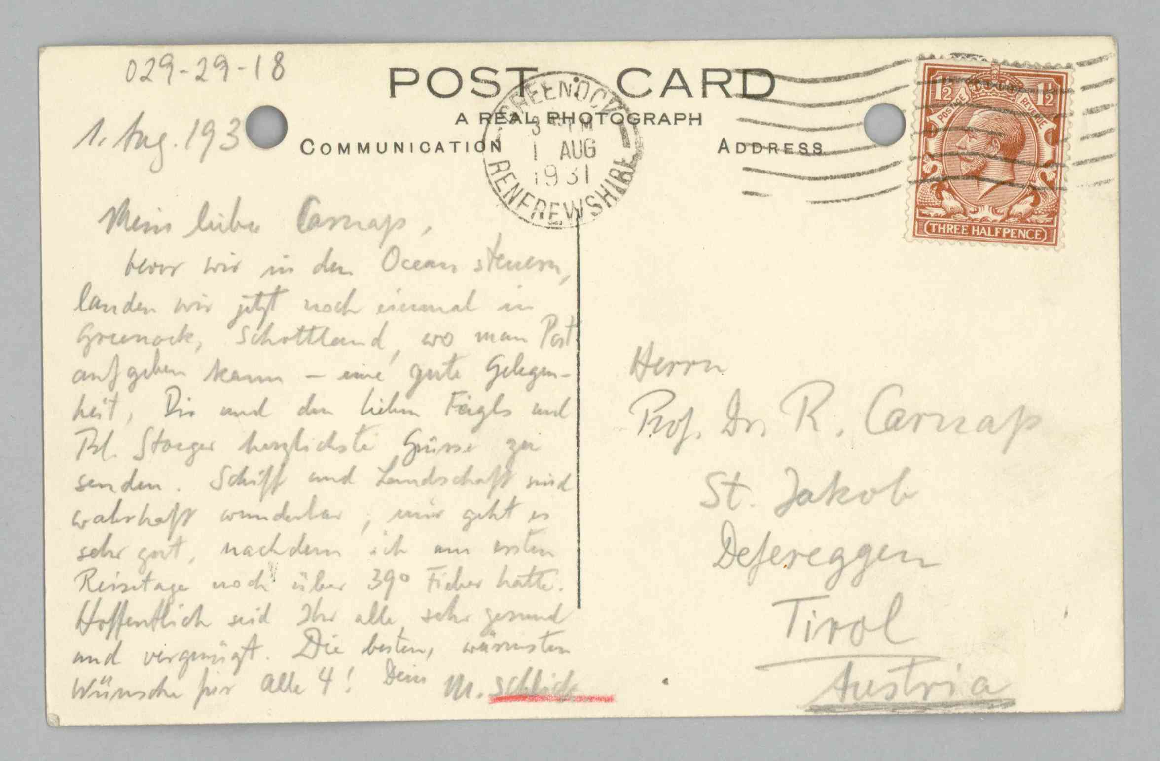 Schlick to Carnap, 1931-08-01 (L) (Original)