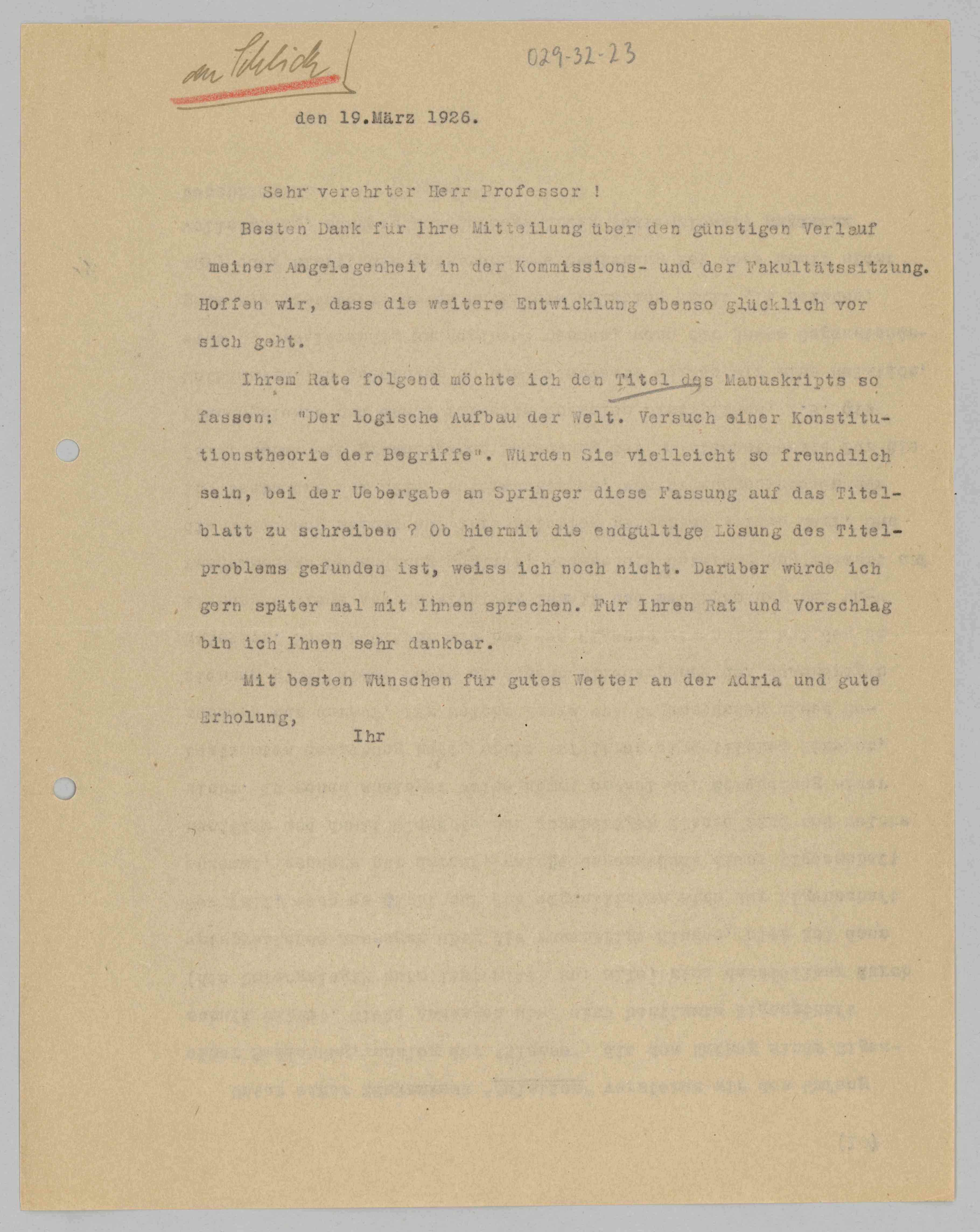 Carnap to Schlick, 1926-03-19 (L) (Copy)