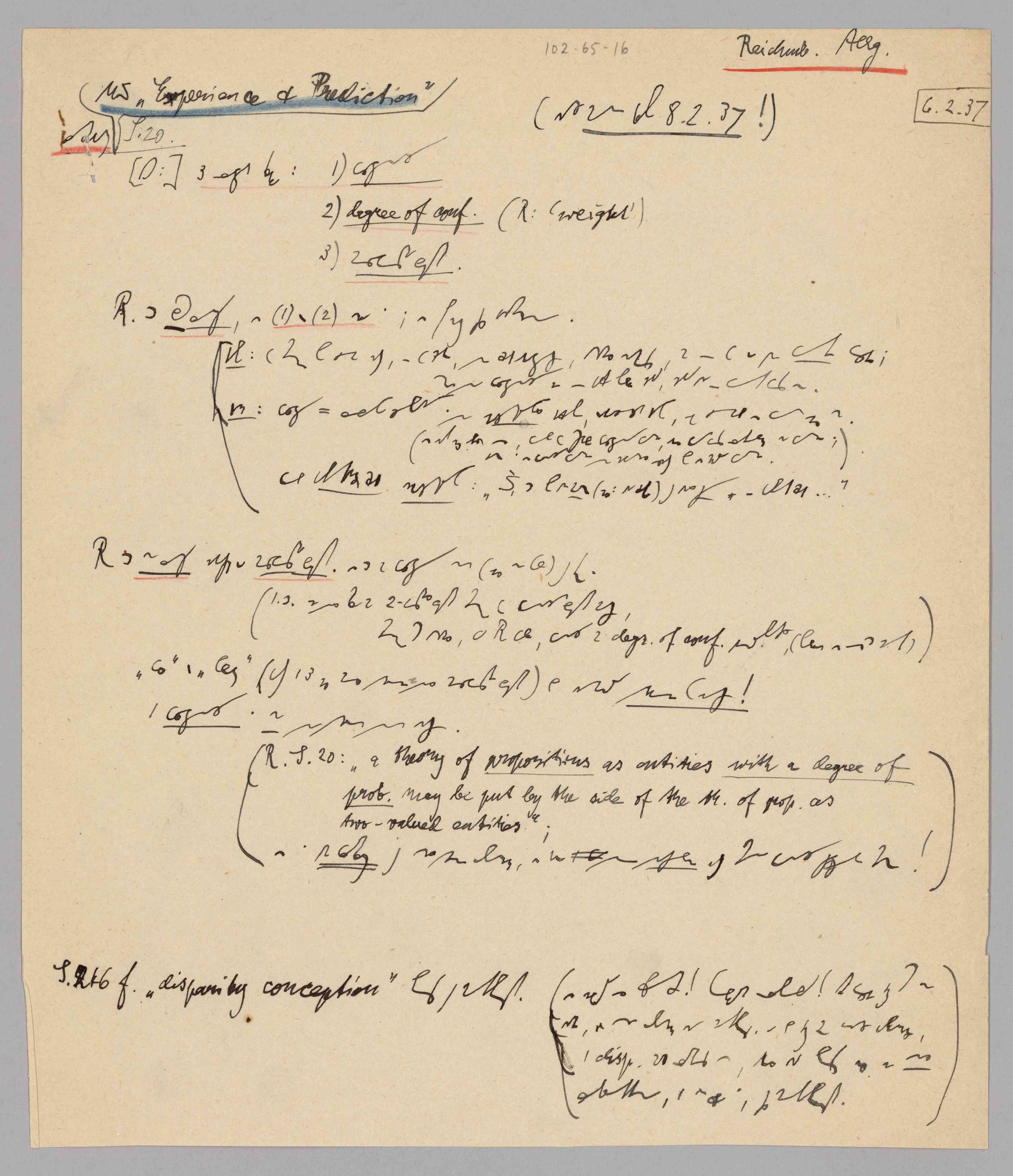 Carnap, Reichenbach, MS Experience & Prediction, 1937-02-06 (M) (Original)