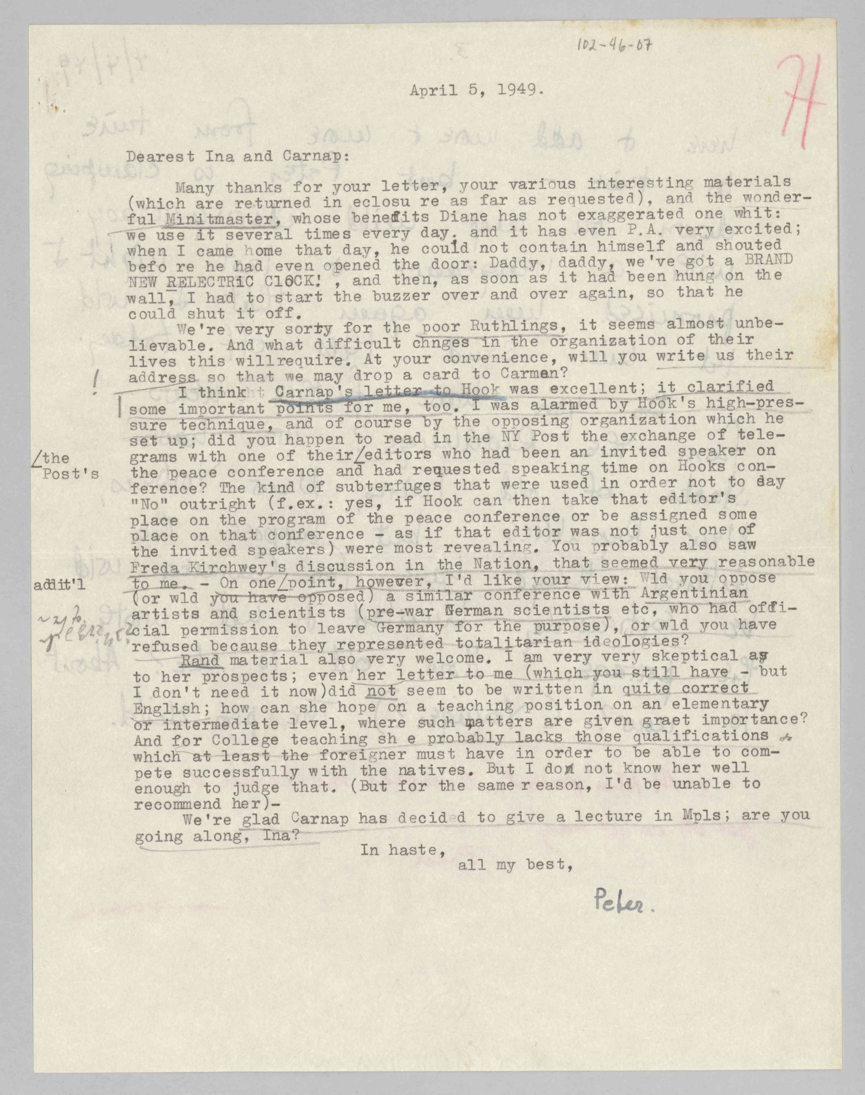 Hempel, Diane Hempel to Carnap, Ina Carnap, 1949-04-05 (L) (Original)