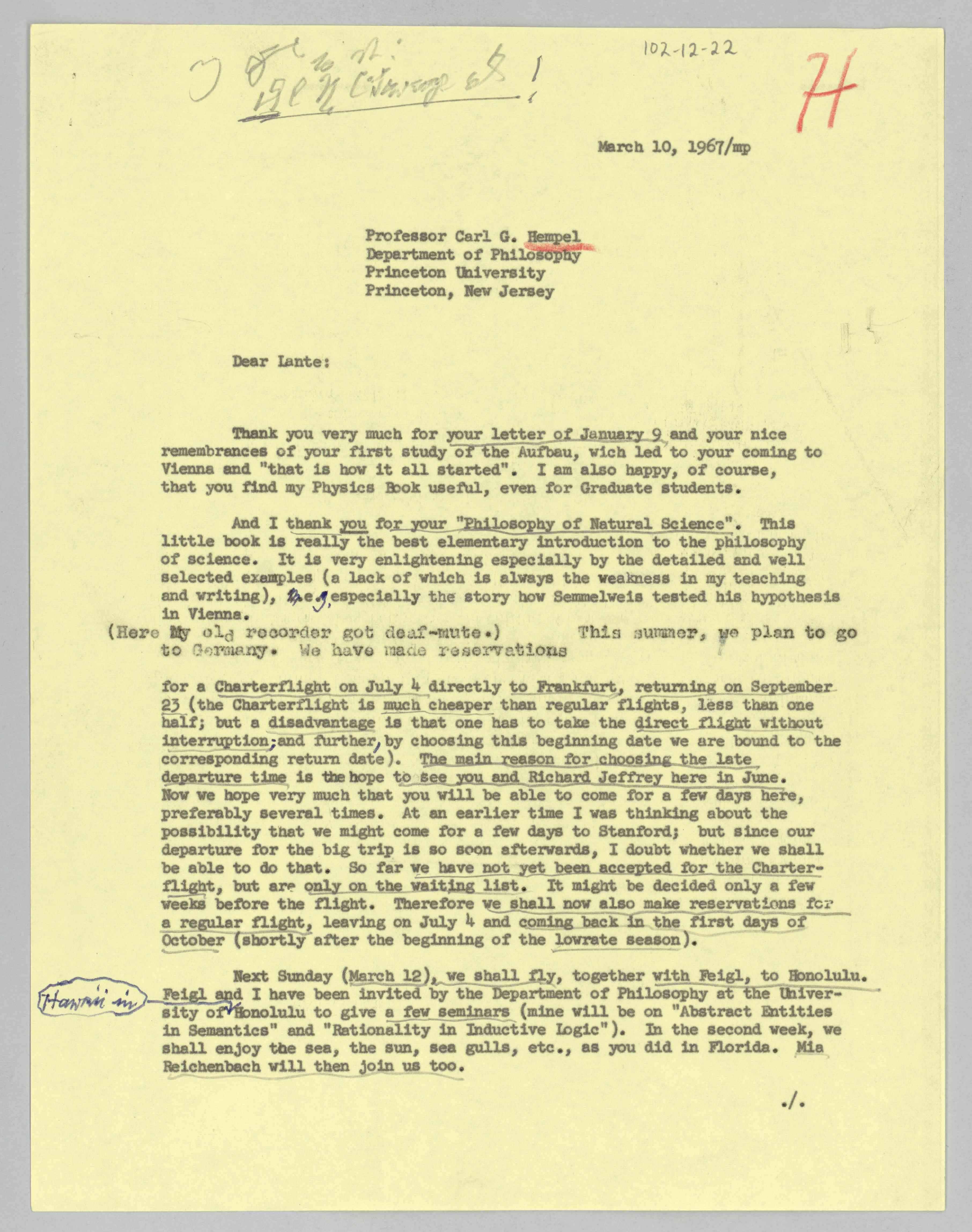 Carnap to Hempel, 1967-03-10 (L) (Copy)