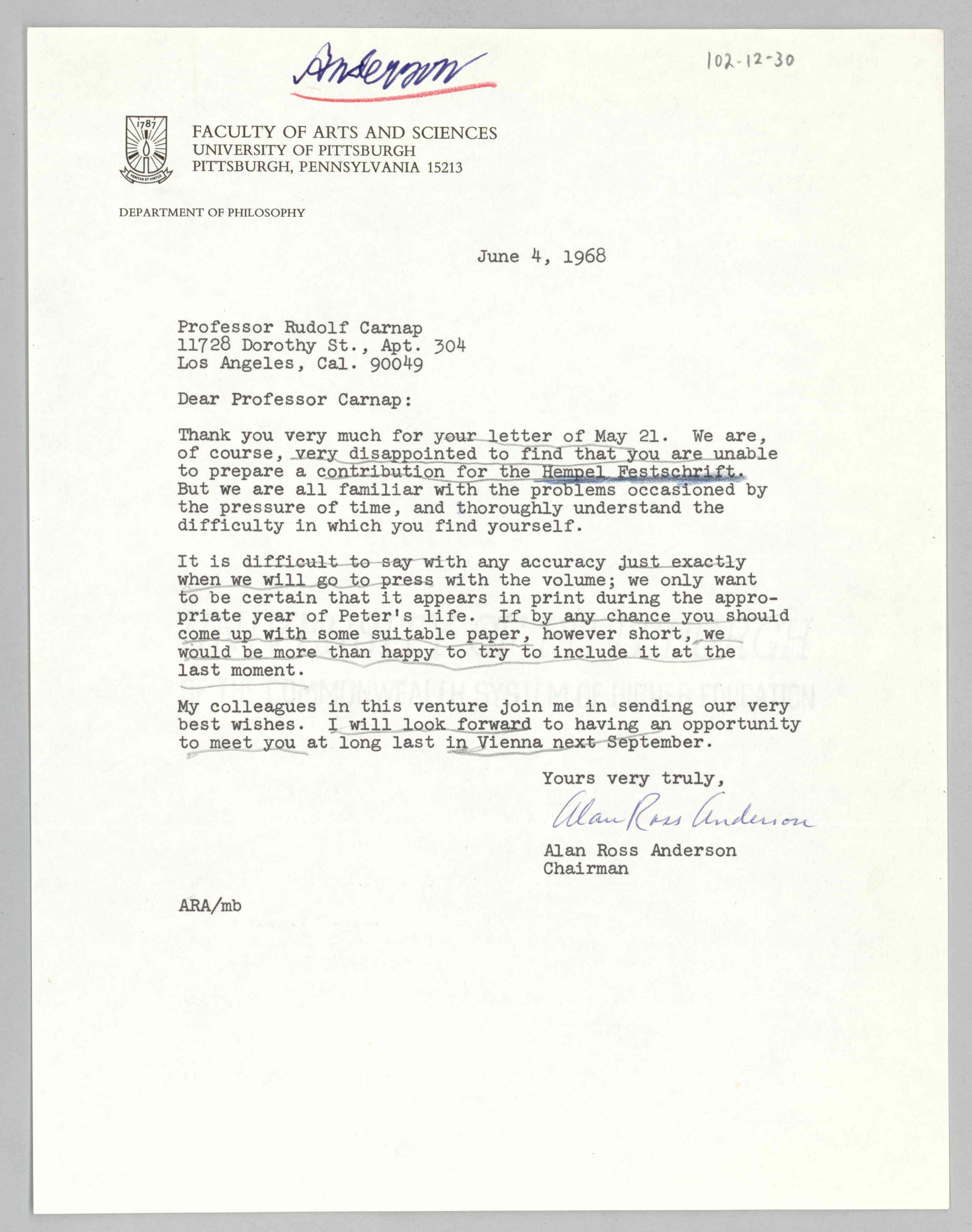 Alan Ross Anderson to Carnap, 1968-06-04 (L) (Original)