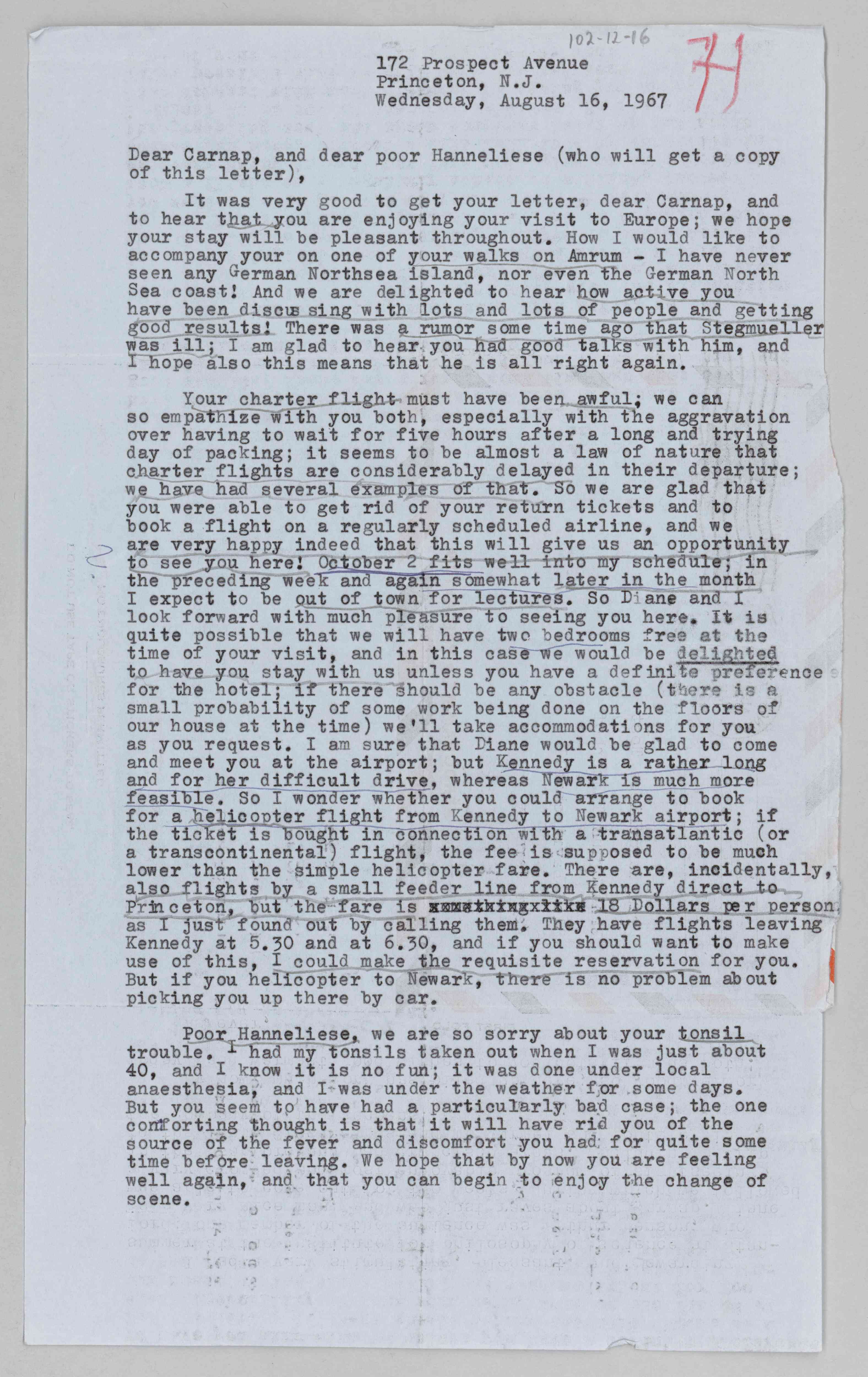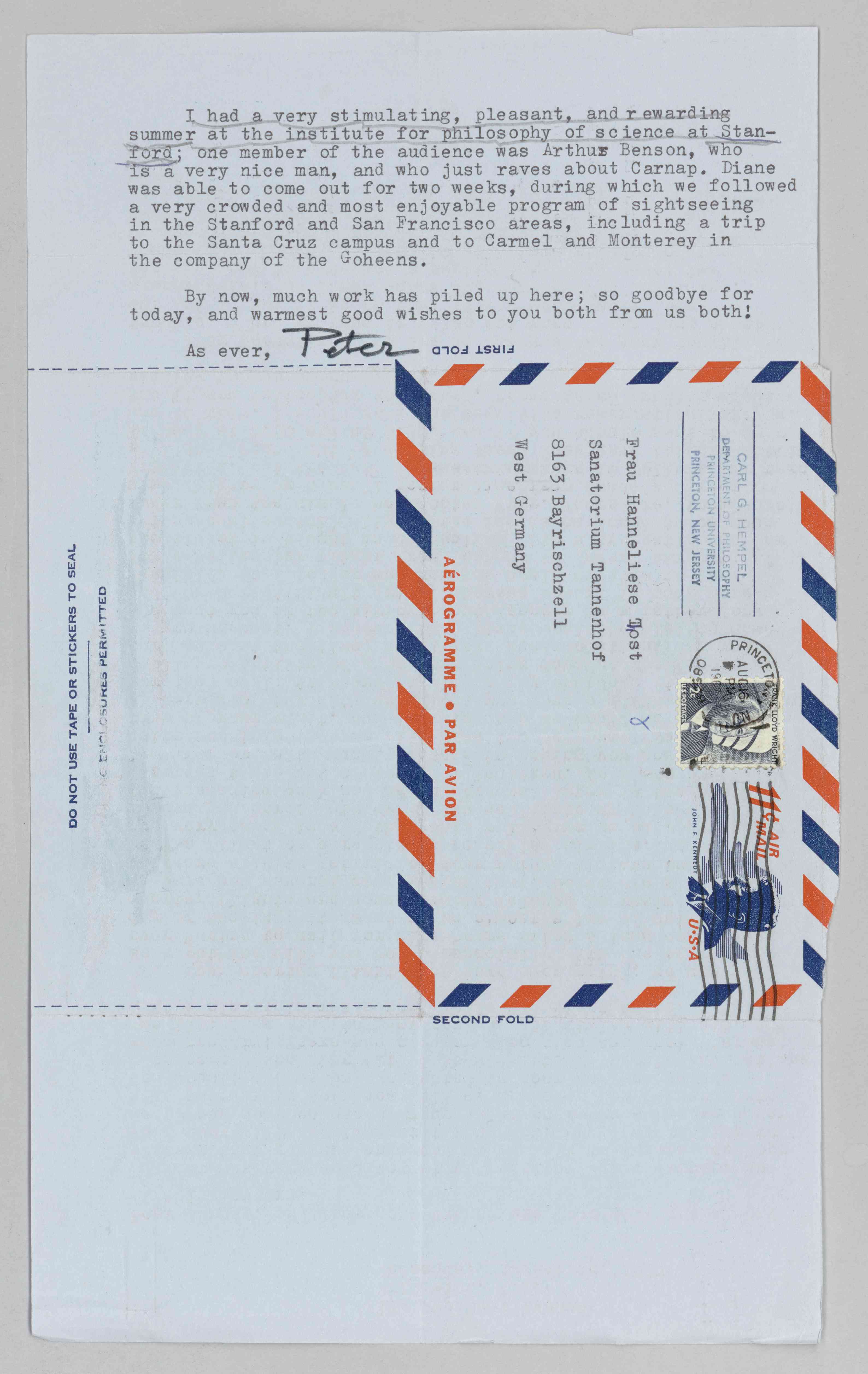 Hempel to Carnap, Hanneliese Thost-Carnap, 1967-08-16 (L) (Copy)