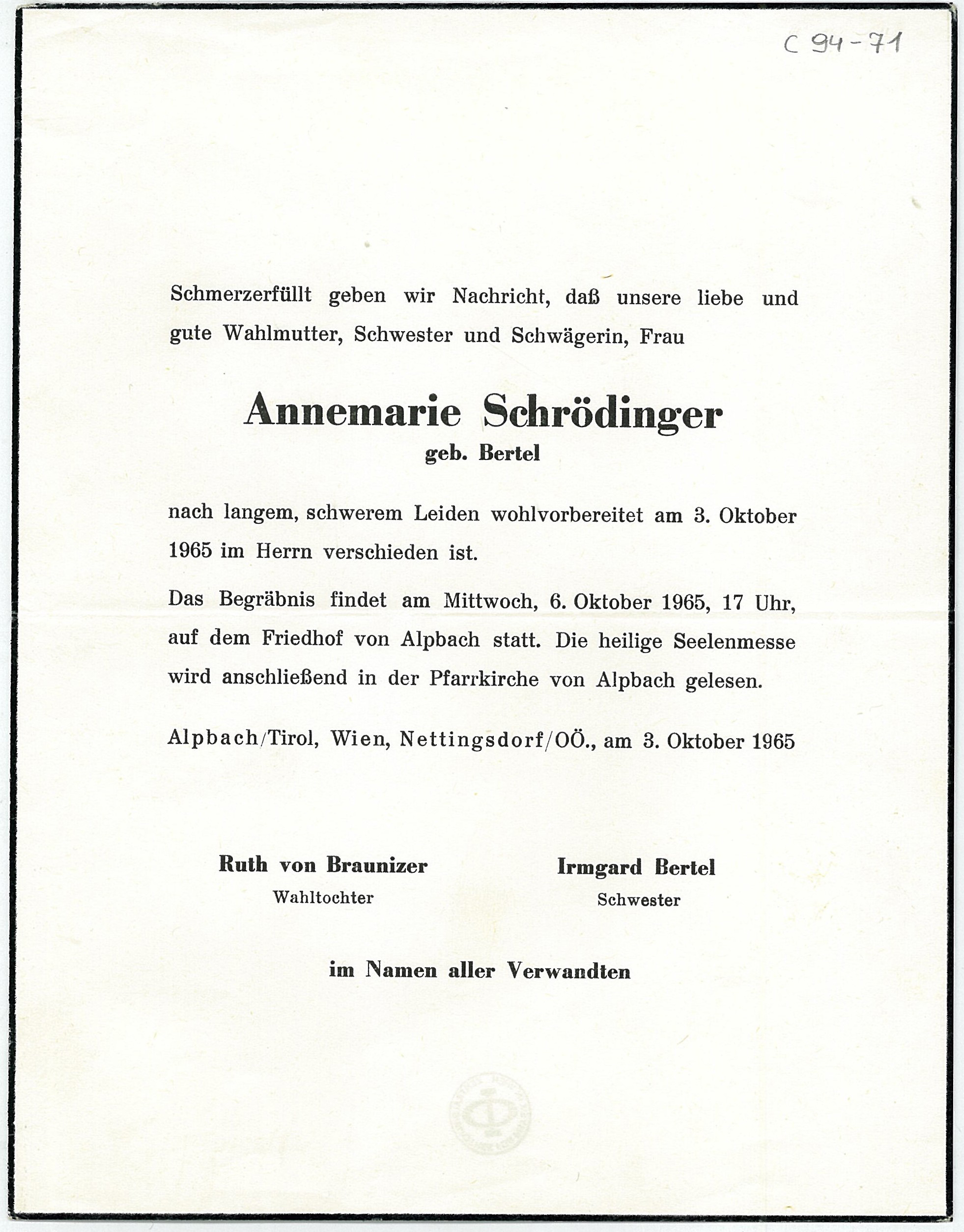Teilnachlass Erwin Schrödinger / Sammlung Irmgard Bertel; Todesanzeige
