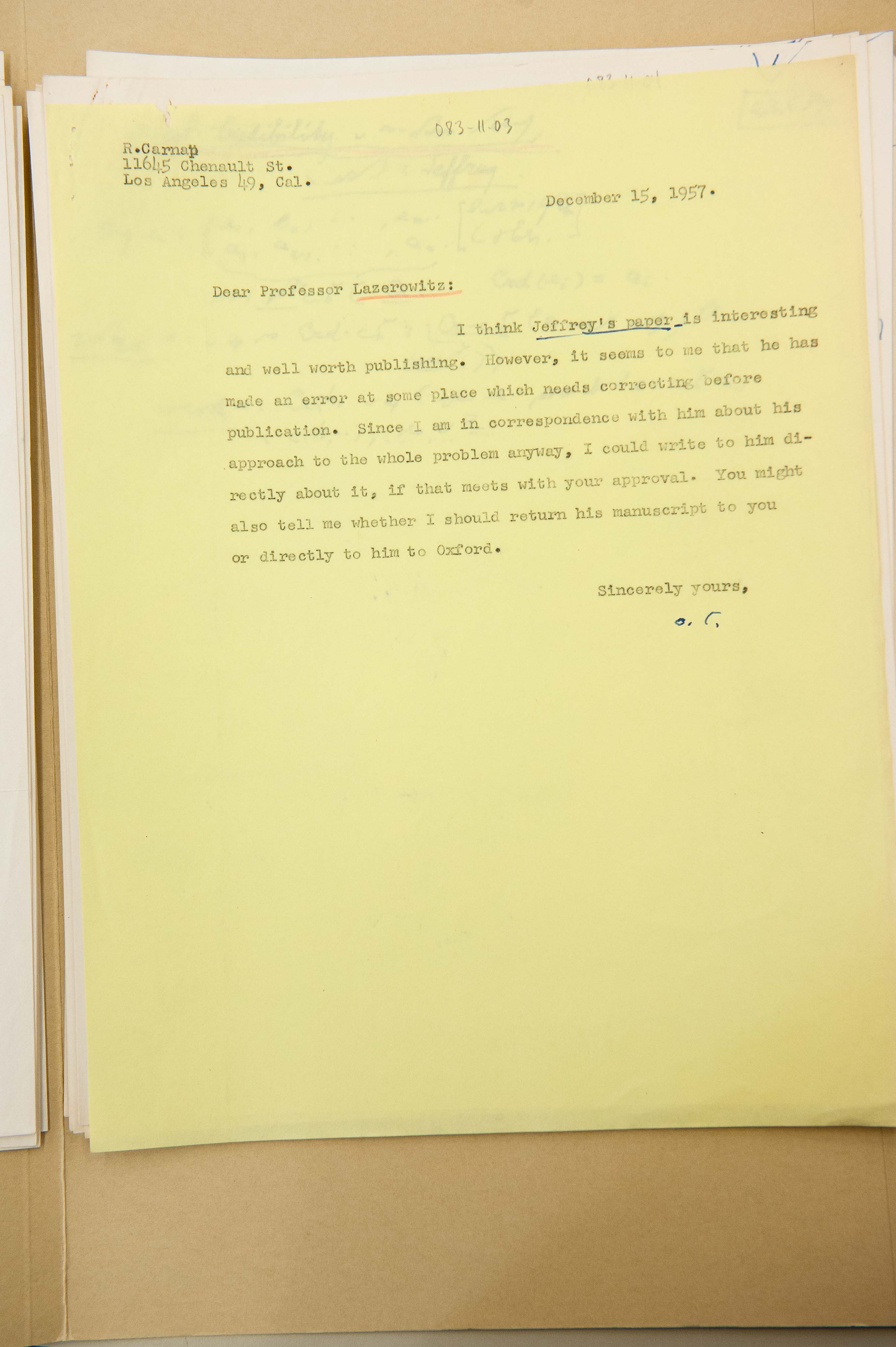 Carnap to Alice Ambrose, 1957-12-15 (L) (Copy)