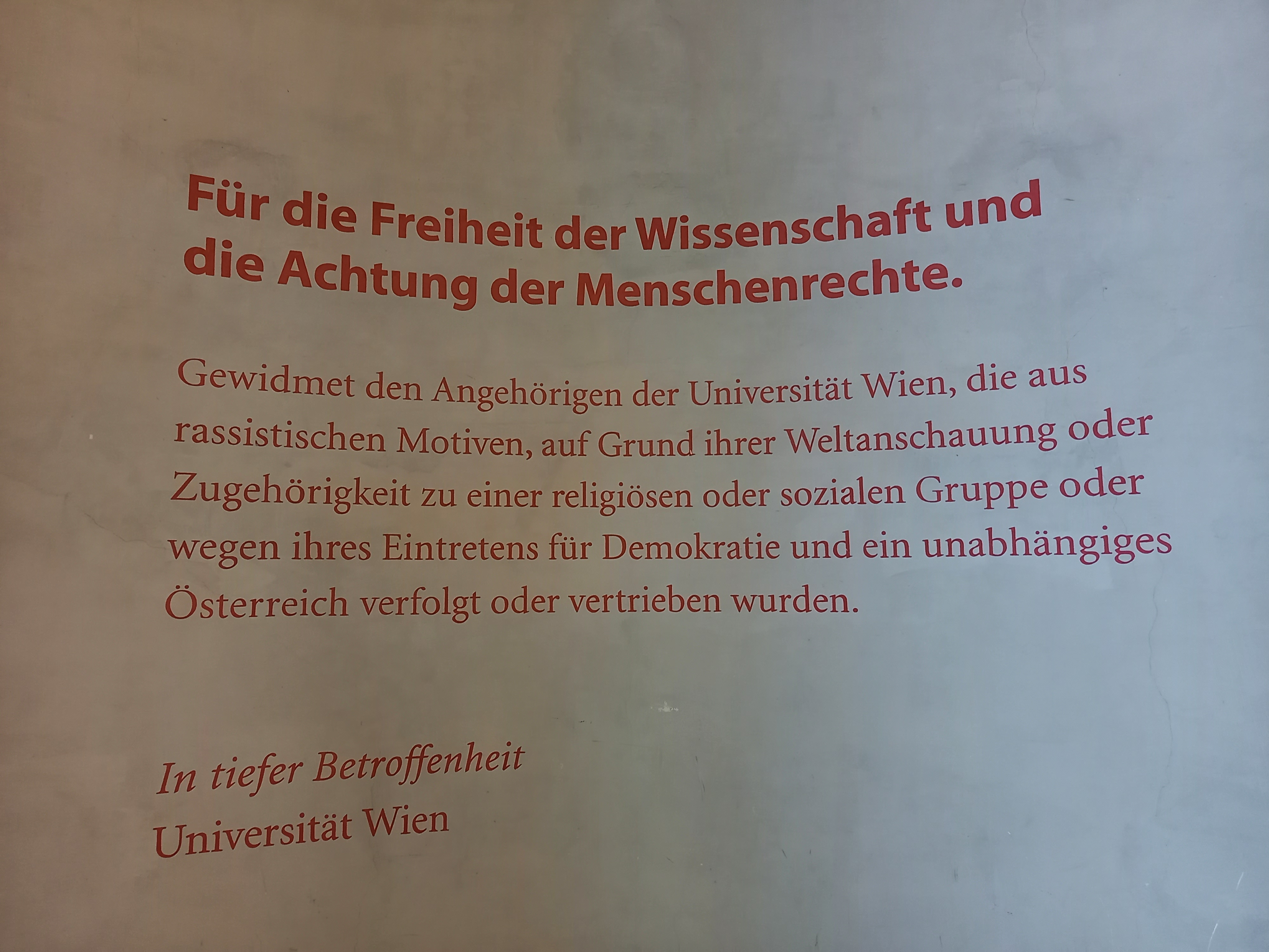Gewidmet den Angehörigen der Universität Wien, die aus rassistischen Motiven, aufgrund ihrer Weltanschauung oder Zugehörigkeit zu einer religiösen oder sozialen Gruppe oder wegen ihres Eintretens für Demokratie und ein unabhängiges Österreich verfolgt oder vertrieben wurden.
