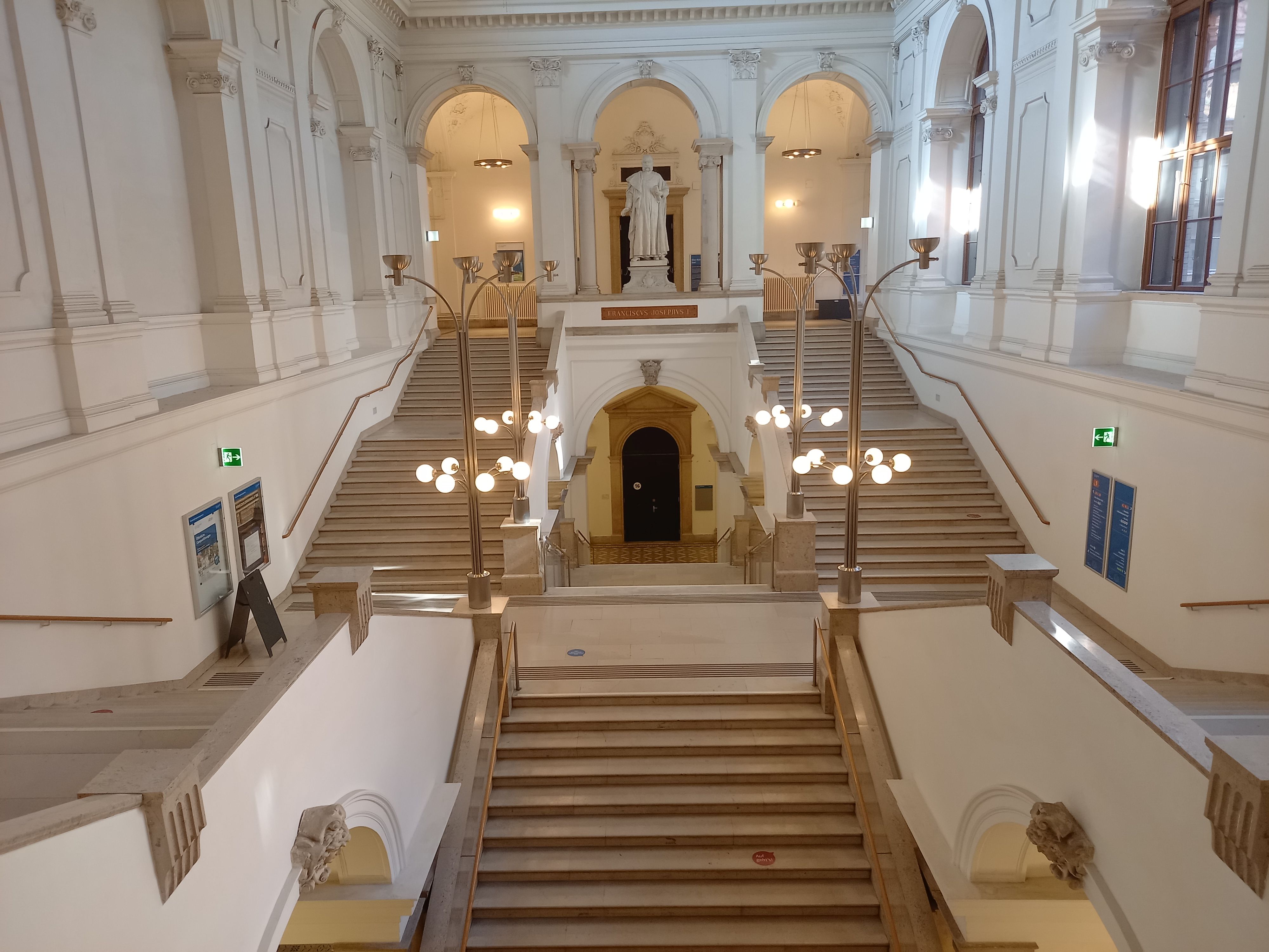 Blick auf die Juristenstiege, Aufgang links der Aula, Hauptgebäude der Universität Wien, Universitätsring 1, 1010 Wien