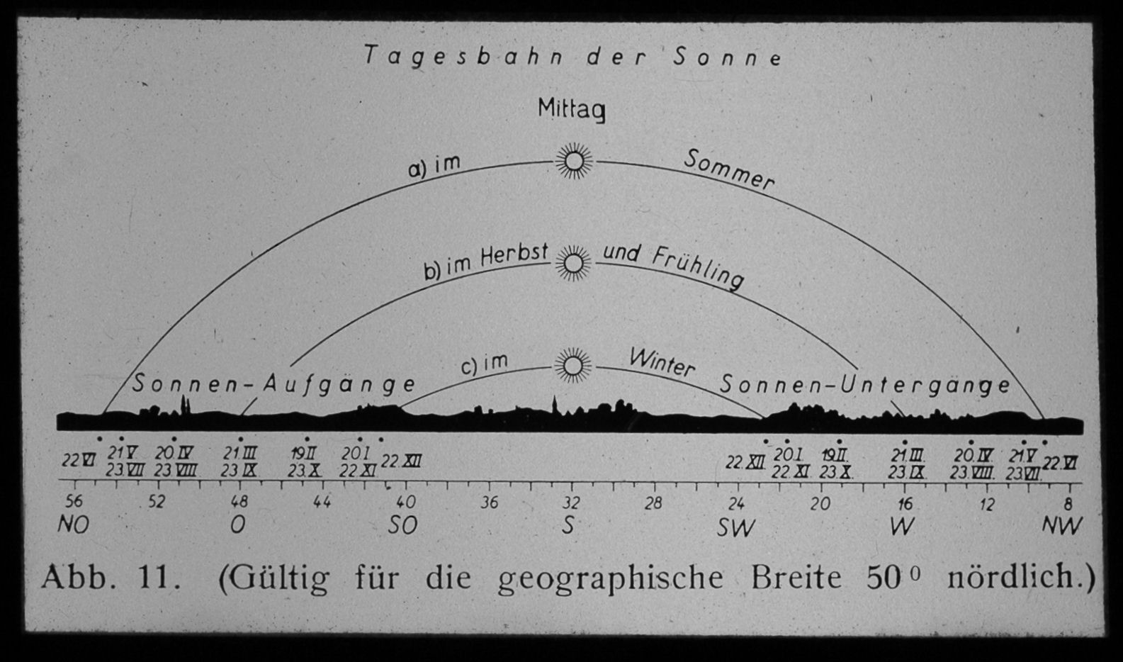 Die tägliche Bahn der Sonne, gültig für die geographische Breite 50° Nord. Die Skizze zeigt die verschiedene Höhe der Sonne in den Jahreszeiten.