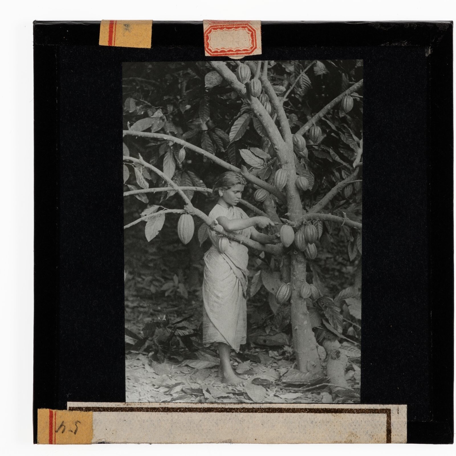 Die Fotografie wurde vermutlich vom Fotostudio Skeen & Co. im ehemaligen Ceylon, heute Sri Lanka, aufgenommen und zeigt ein Mädchen, welches mit einem Messer die Früchte von einem Kakaobaum erntet. Quelle unbekannt, Fotograf*in unbekannt.