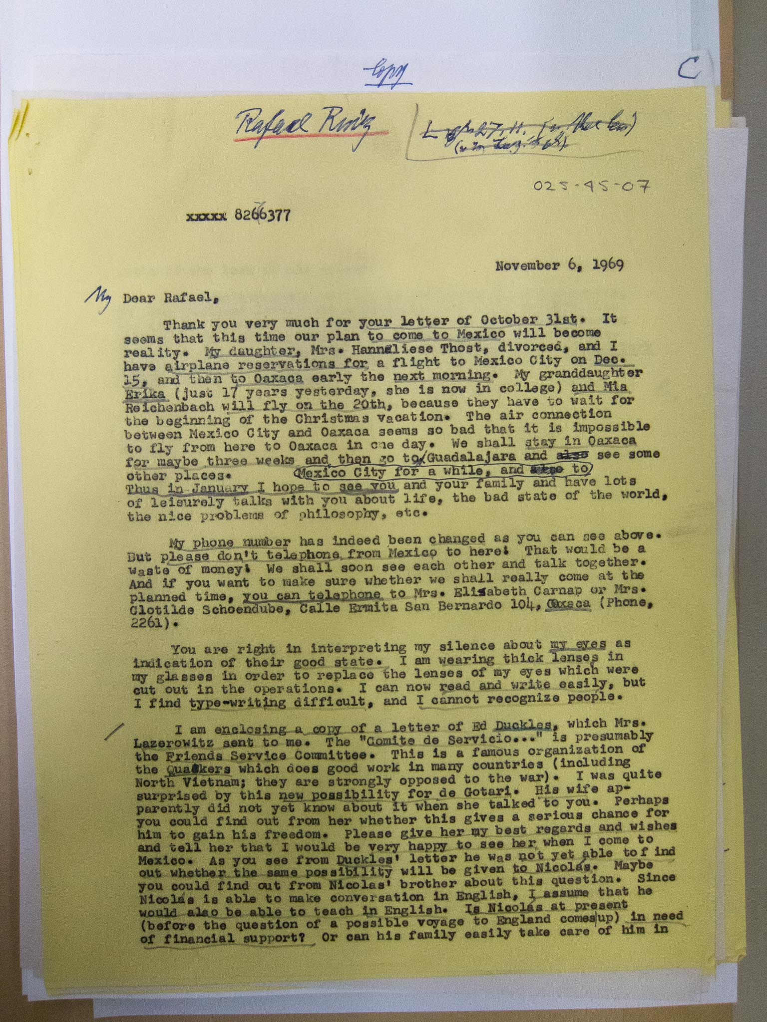 Carnap to Rafael Ruiz Harrell, 1969-11-06 (L) (Copy)