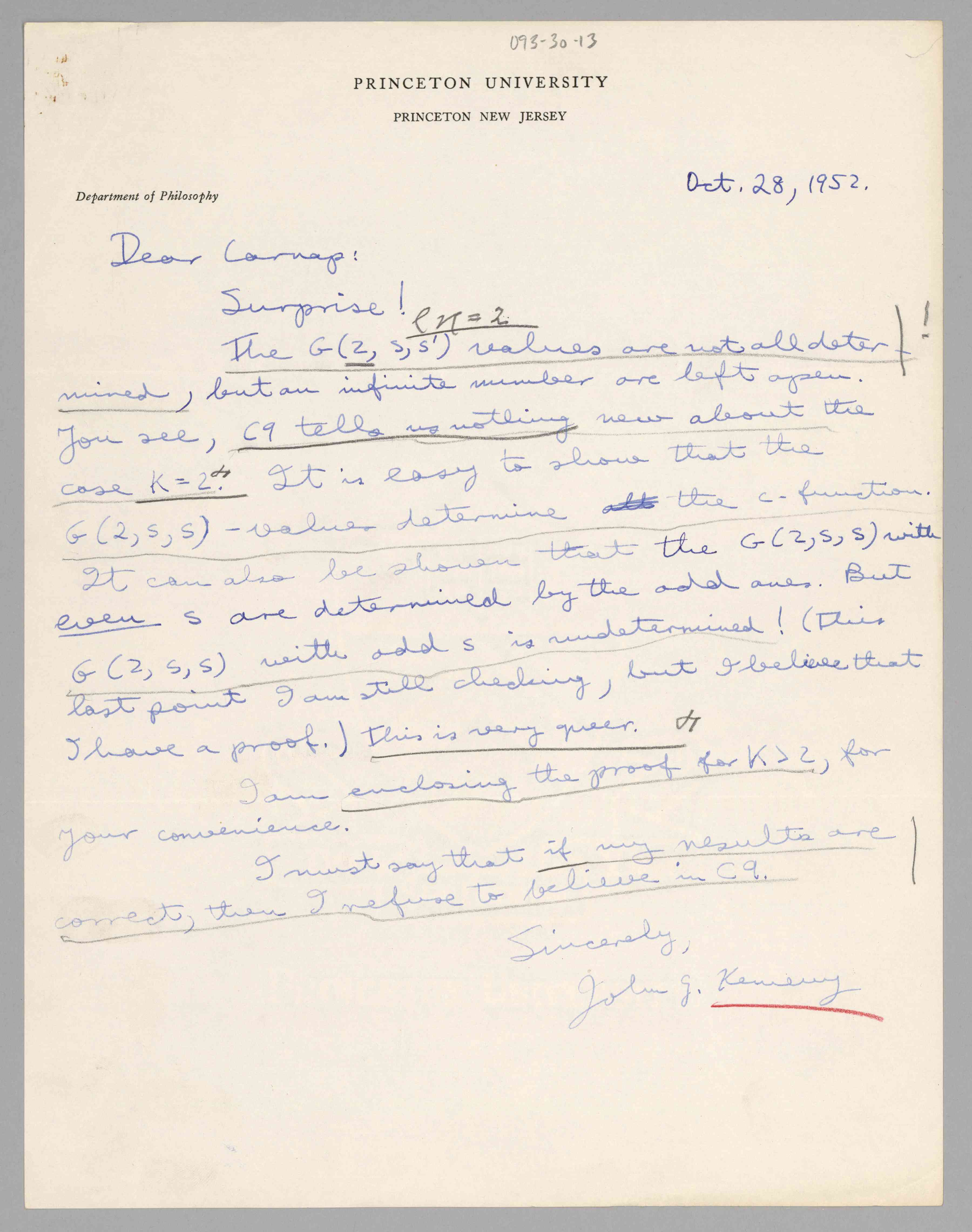 John Kemeny to Carnap, 1952-10-28 (L) (Original)