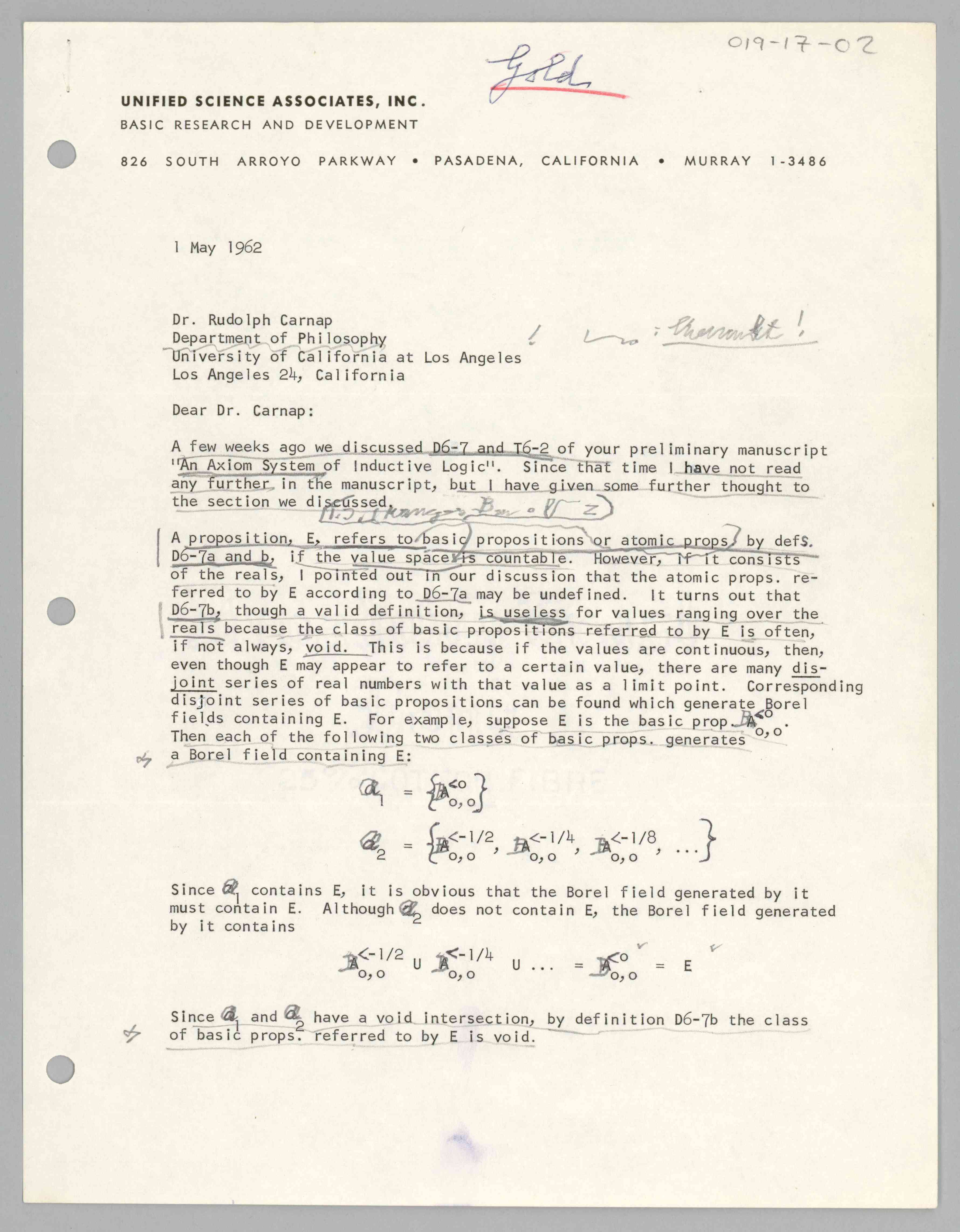 E. Mark Gold to Carnap, 1962-05-01 (L) (Original)
