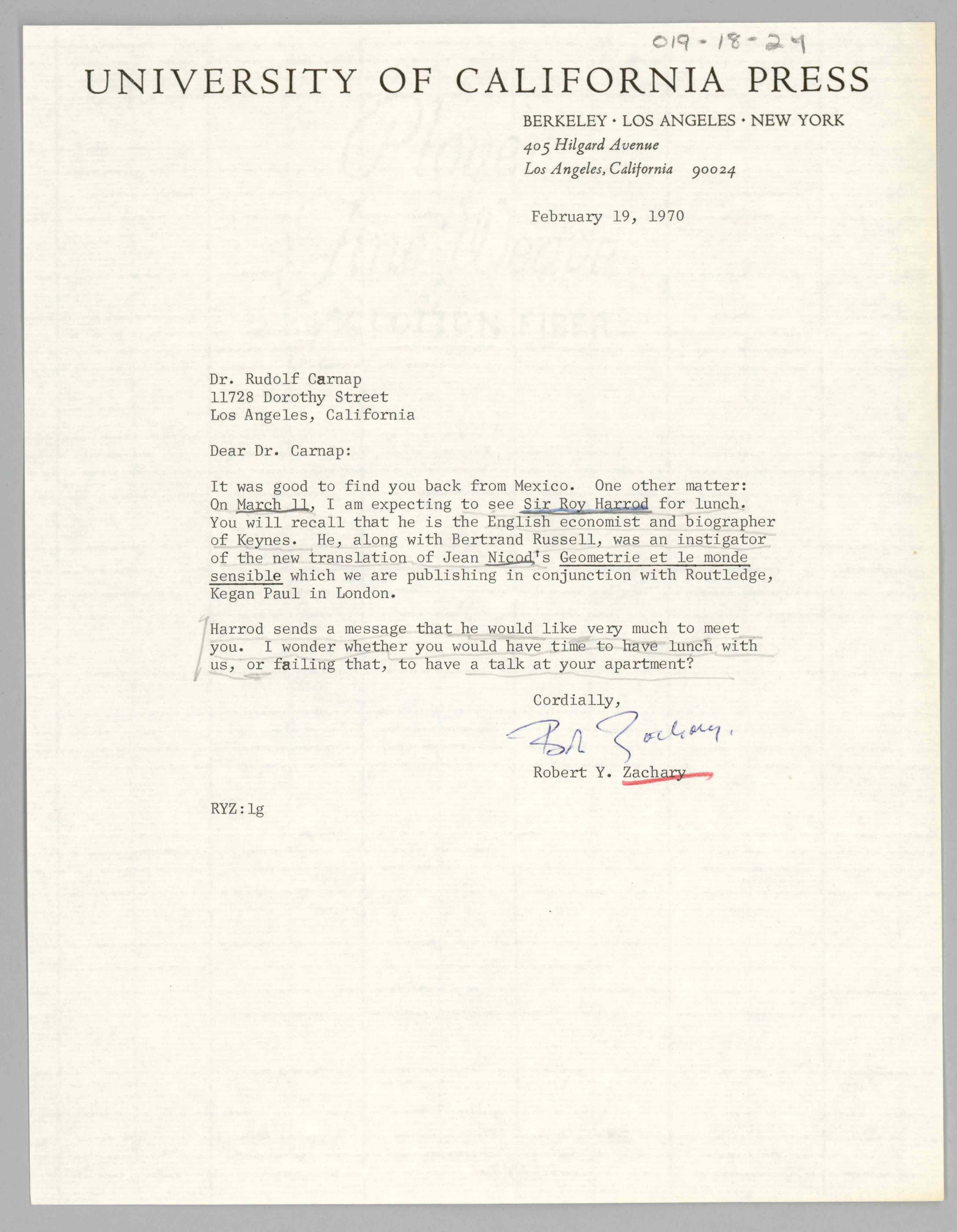 Robert Zachary to Carnap, 1970-02-19 (L) (Original)