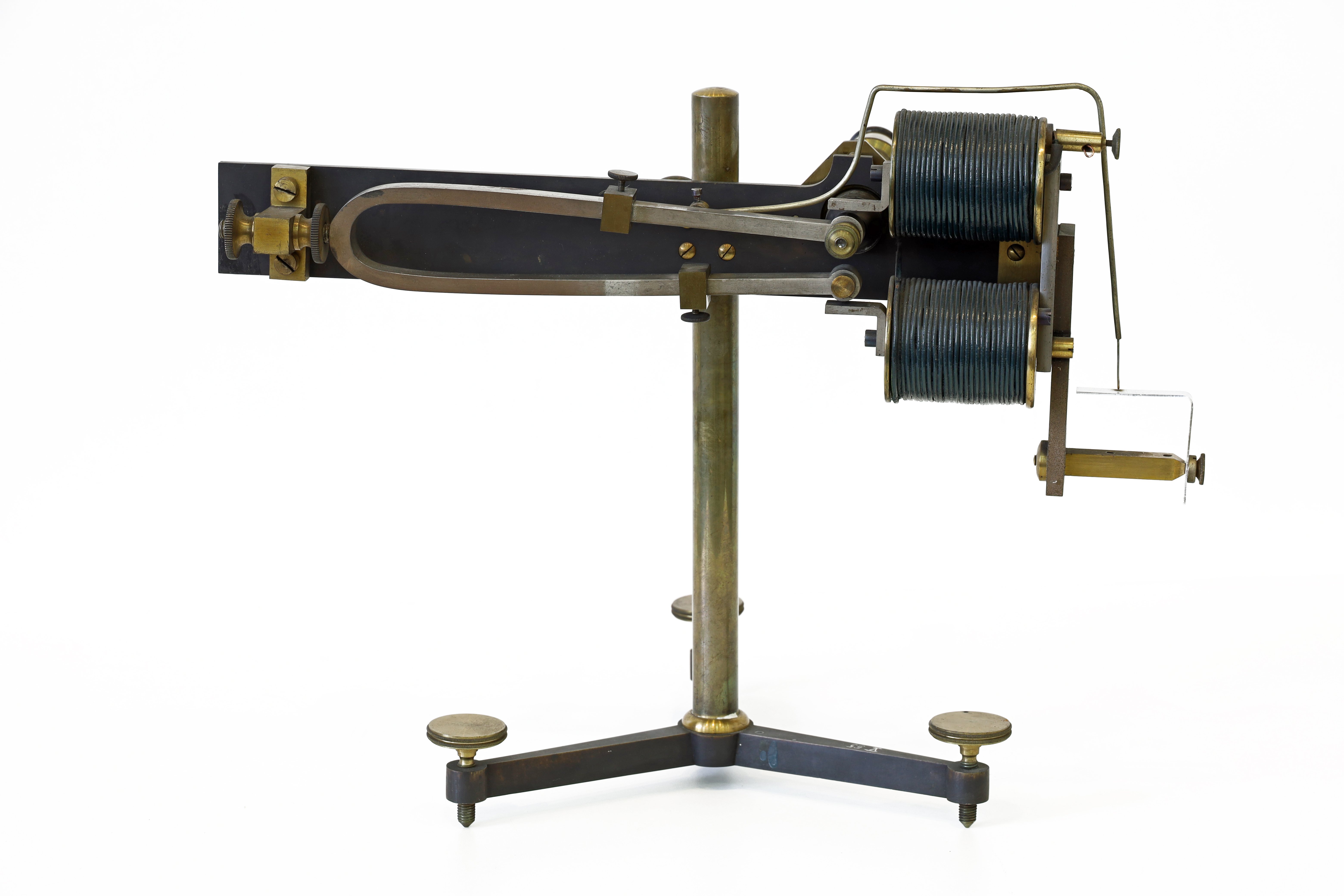 Vibrationsmikroskop mit 97 Hz-Stimmgabel. Der Quecksilbernapf ist hier ersetzt mit einem Stück Aluminiumblech und Kontaktdraht..