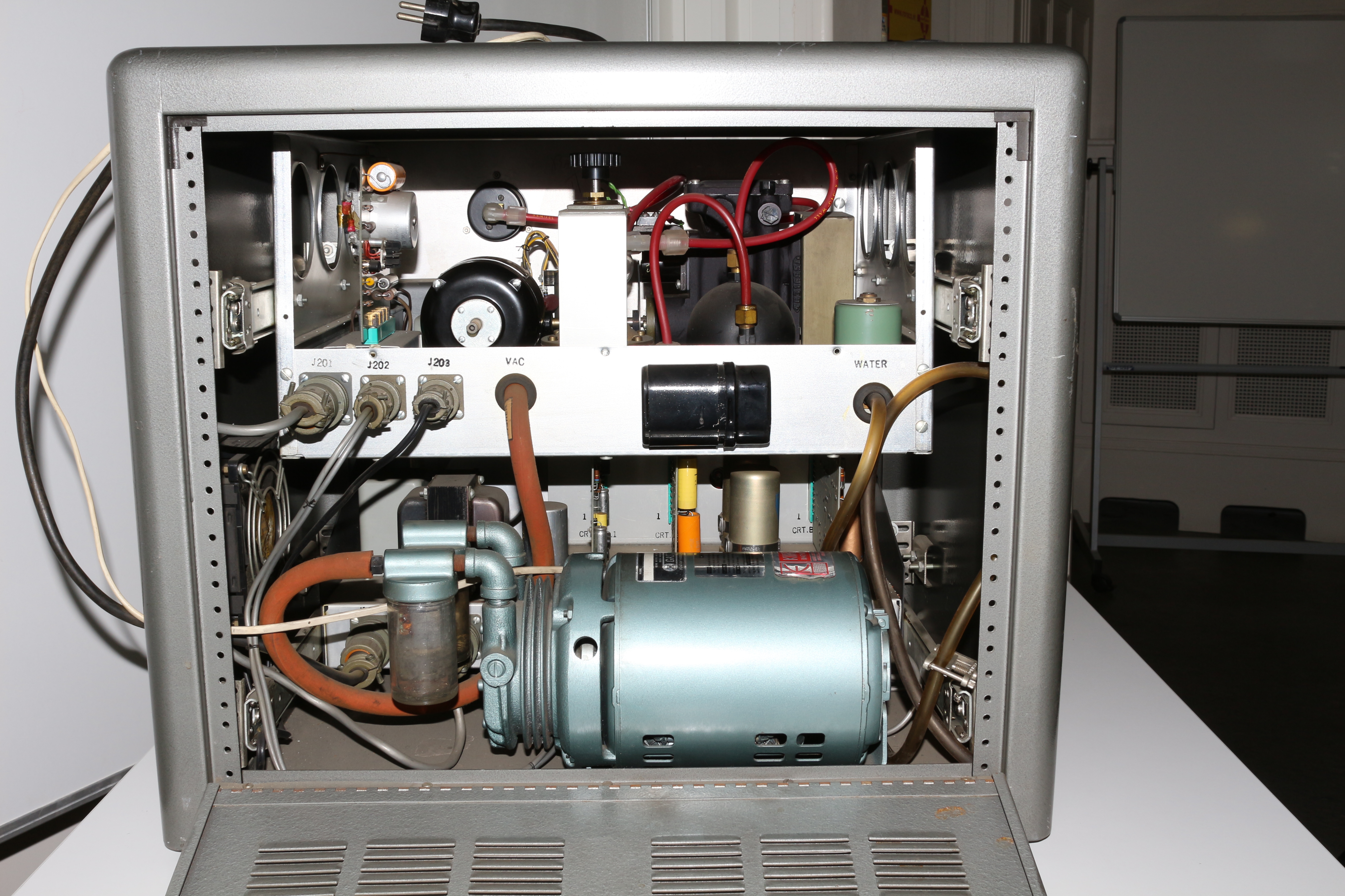 Laut Inventar-Nr. 63/21 des I. Physikalischen Institutes wurde dieser Kondensationskernzähler im Jahre 1963 angeschafft. Damit war es für die Aerosolphysik der Universität Wien erstmals möglich, kleine Partikel zu zählen. Dieses Objekt kam im Jahre 2015 in die historische Sammlung. Dieses Bild zeigt die geöffnete Rückseite.
