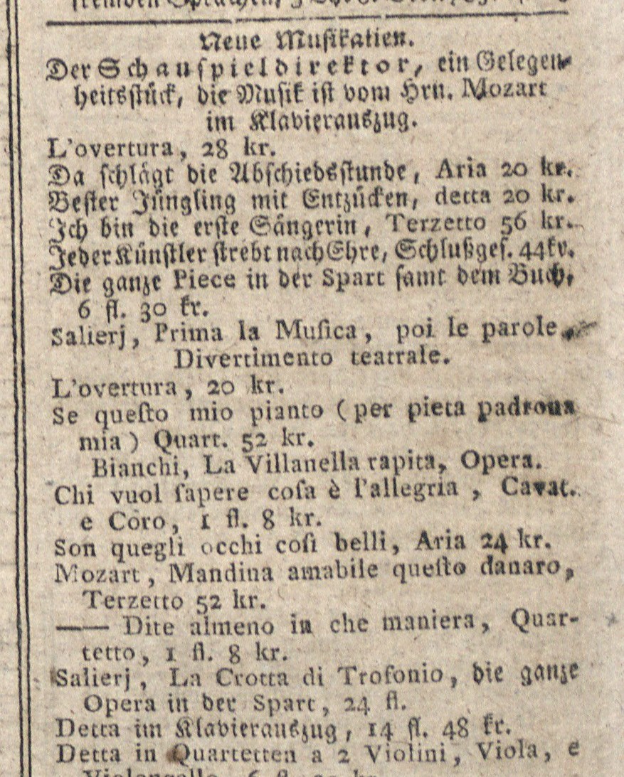 In dieser Ausgabe von der Wiener Zeitung werden die Werke Mozarts und Salieris beworben - siehe auch: „ Das Fest in der Orangerie zu Schönbrun – 7. Februar 1786“
