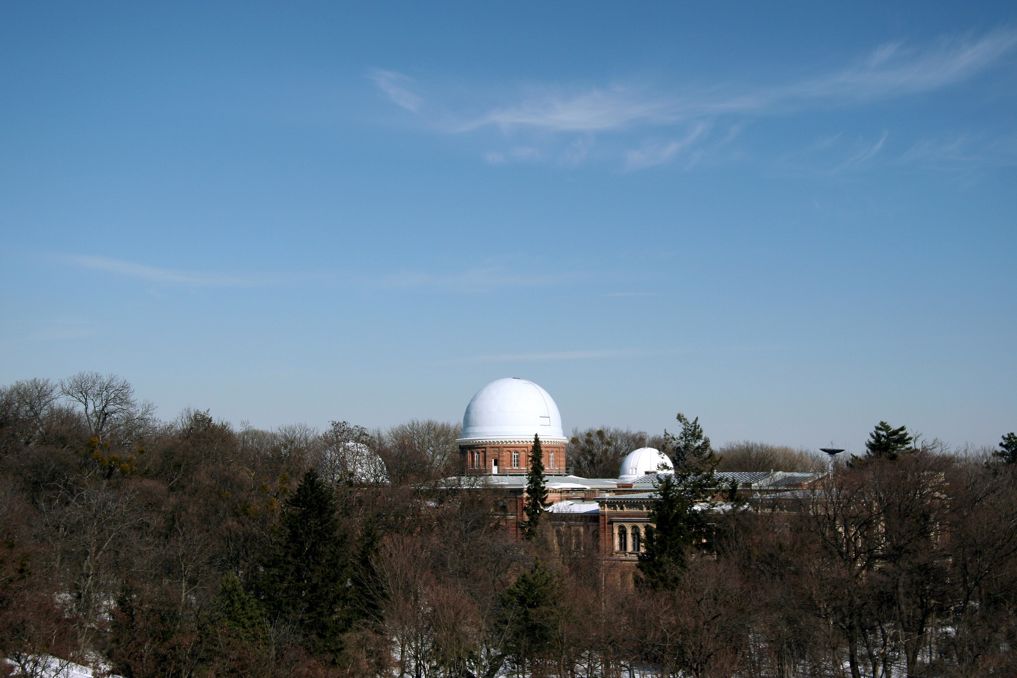 Gesamtansicht des Instituts für Astrophysik. Aufgenommen vom Kirchturm der Weinhauser-Kirche. Die große 14 m Kuppel der Sternwarte dominiert das Bild. Süden ist am rechten Bildrand. Aufgenomen von Prof. Franz Kerschbaum.