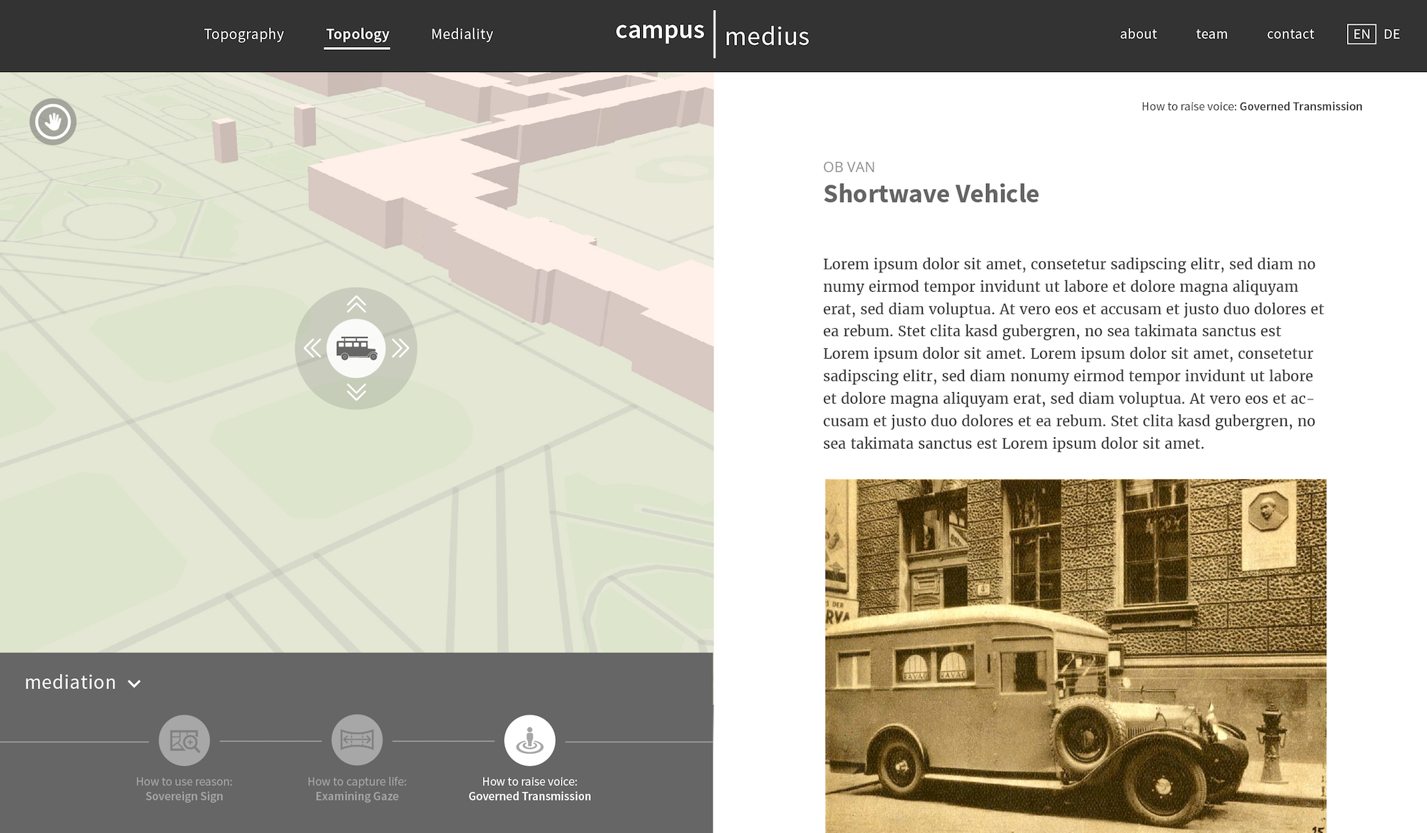 Layout of the forthcoming version of {link}http://campusmedius.net{/link}, showing the section "Topology", the mediation "How to raise voice: Governed Transmission", and the mediator "Shortwave Vehicle" (PI: Simon Ganahl, coding: Andreas Krimbacher, design: Susanne Kiesenhofer)